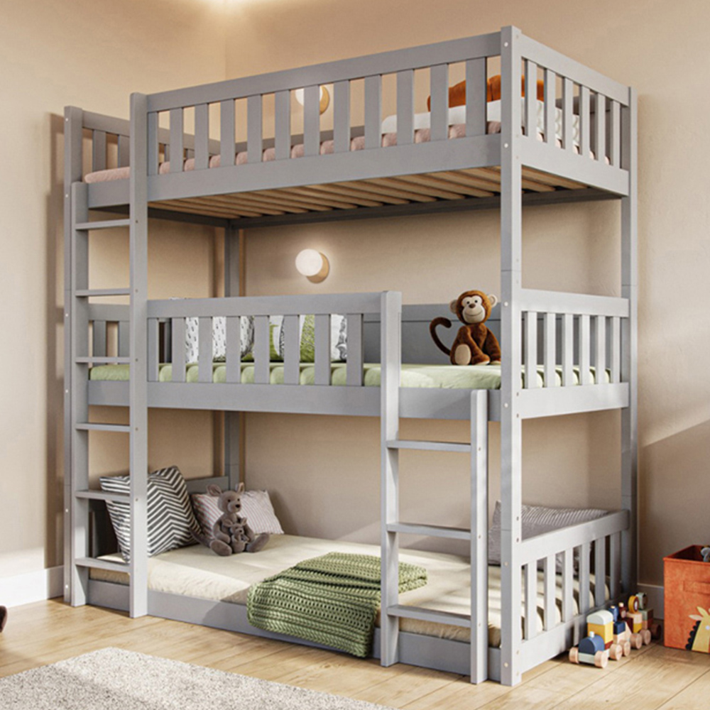 Upgrade your children's sleeping experience with this Flair Bea Grey Triple High Wooden Bunk Bed. An ultimate space-saving solution and an epitome of style and functionality, this triple-high bunk bed is crafted from exquisite pine wood and finished in grey colour. Designed with both versatility and aesthetics in mind, this innovative bunk bed promises to be the focal point of any bedroom. The solid construction ensures the safety and security of its occupants, giving parents peace of mind while their children enjoy a restful night's sleep. Ingeniously designed to optimize the use of vertical space, this bunk bed is ideal for shared bedrooms or guest rooms with limited floor space. Its three-tiered configuration allows accommodating up to three individuals comfortably, making it perfect for families, sleepovers, or hosting guests.