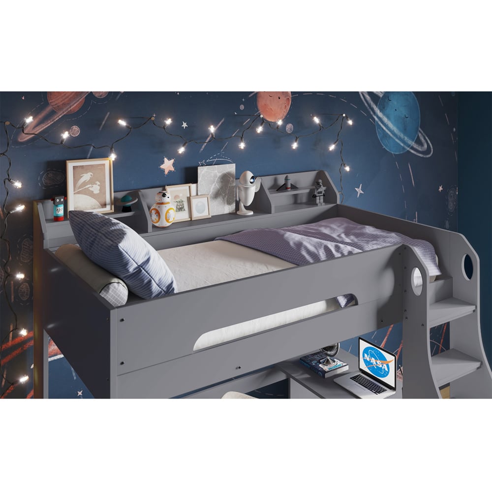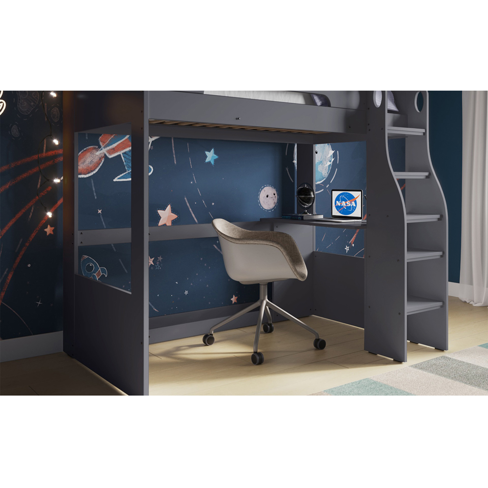 Redesign your room in a limited space with this Cosmic Grey Wooden High Sleeper Frame by Flair. This uniquely designed bed frame is built from solid, sturdy particle board and will give you or your kids a sleeping area and an area for studying, drawing, or working within a single space. The loft bed combination features a bed at the top bunk with raised side panelling and an open space underneath with a desk, suitable for kids to do their homework and for individuals working from home. It also has built-in shelves and a reversible ladder, with wide steps to ensure safety and comfort while climbing up and down. The ladder also can be built on either the left or right-hand side of the bed. With this high sleeper, you can add eye-catching furniture to your bedroom.