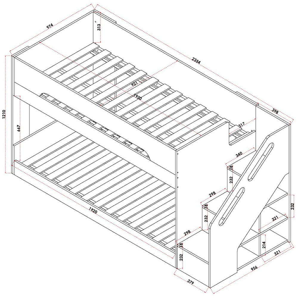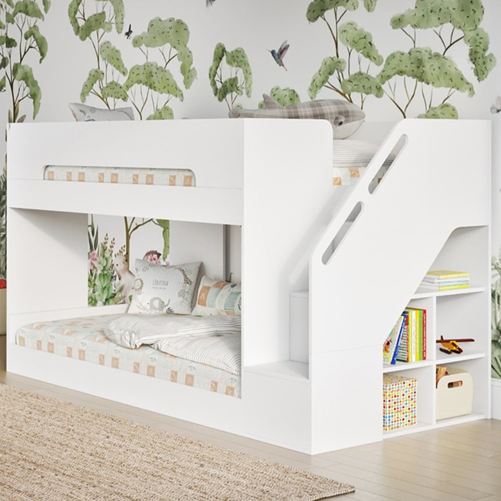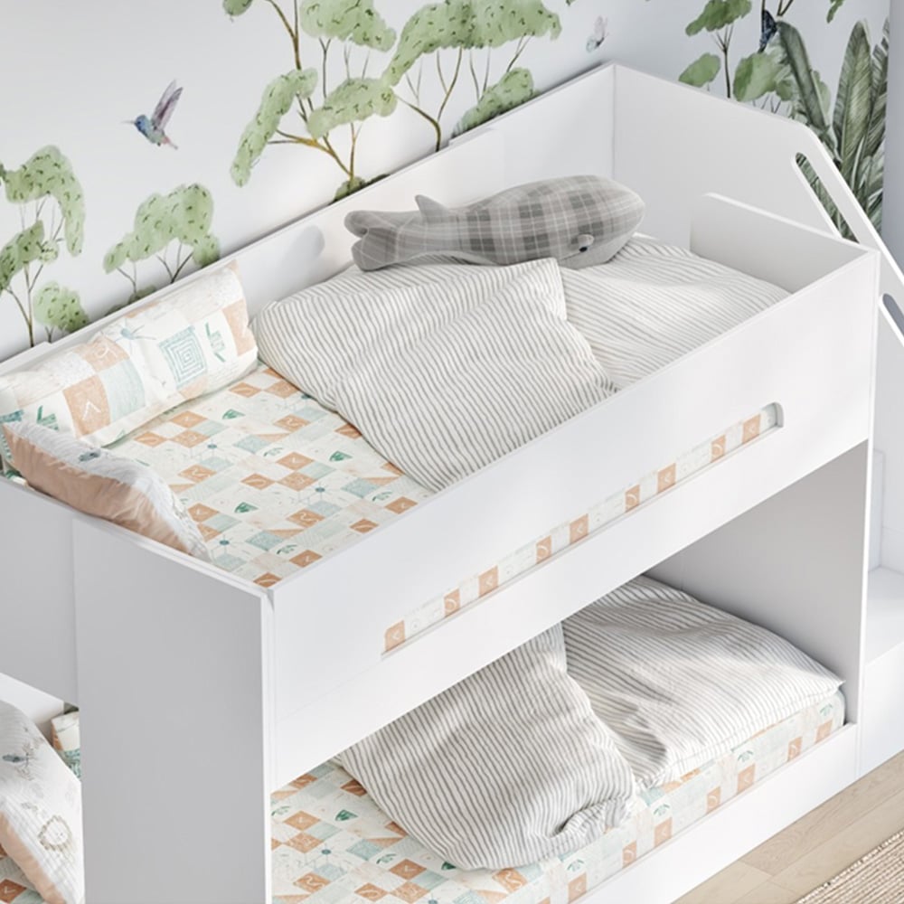Introducing the Flair Deimo Staircase Low Bunk Bed in White—a perfect blend of modern style and practical design for your child’s bedroom. This bunk bed offers a sleek, minimalist look while ensuring safety and comfort. It’s an ideal solution for creating a cosy and stylish sleeping area that complements contemporary home décor. Key Features: Modern Aesthetic: All-white finish with clean lines, perfect for modern and contemporary interiors. Safe Top Bunk: Features a discreet guard rail for added safety without compromising on style. Cosy Bottom Bunk: Semi-enclosed design creates a snug, inviting space, perfect for bedtime stories. Integrated Staircase: Right-side staircase with wide, rounded steps for safe and easy access to the top bunk. Smart Storage: Built-in open shelves under the staircase for convenient storage of books, toys, and other essentials.