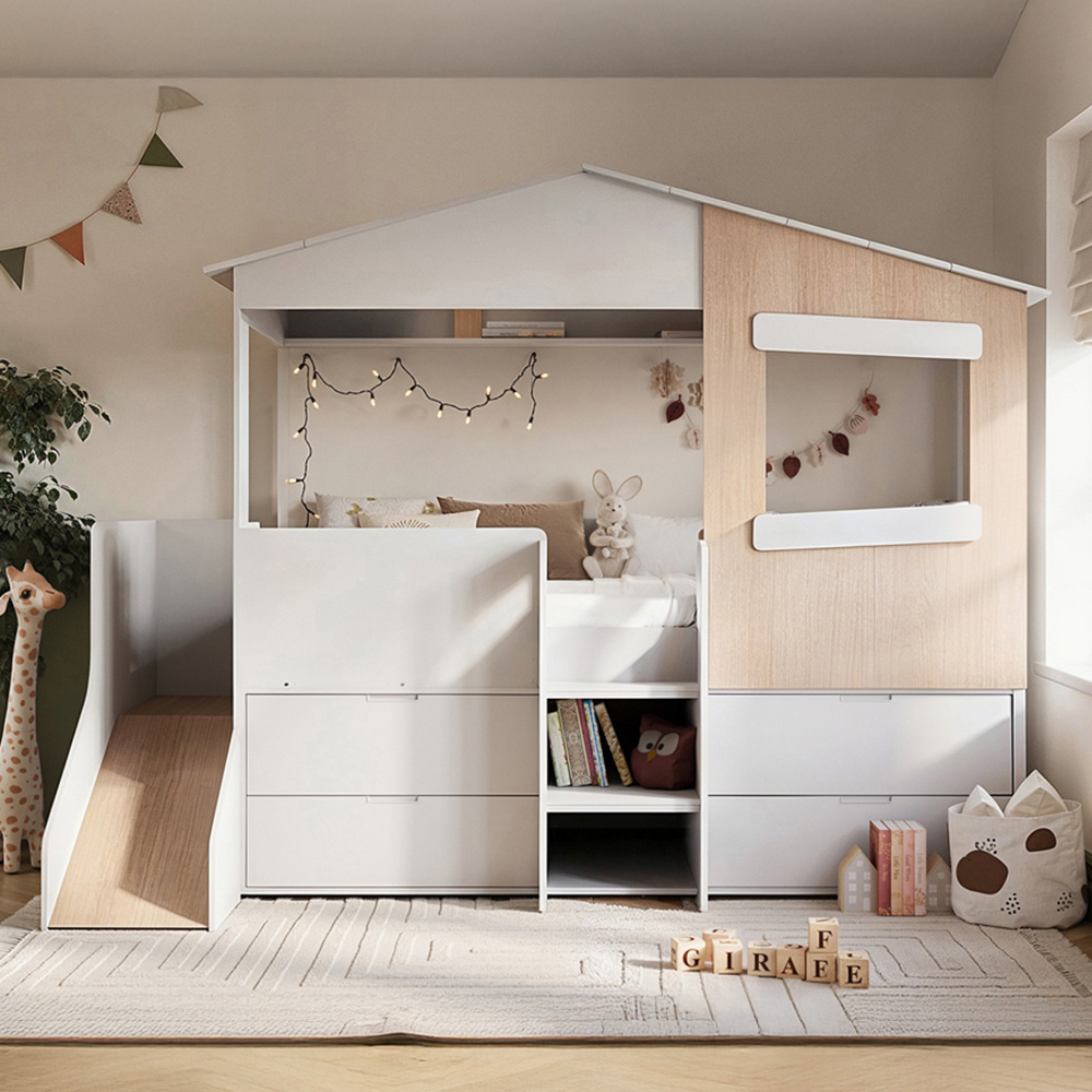 Transform your child room into a haven of creativity and organisation with the Flair Dreamland House Mid Sleeper with Slide and Storage. This thoughtfully designed bed combines functionality, playful design, and elegant aesthetics to cater to both parents and children alike. The fun integrated slide adds excitement to your child daily routine, turning every morning into an adventure.