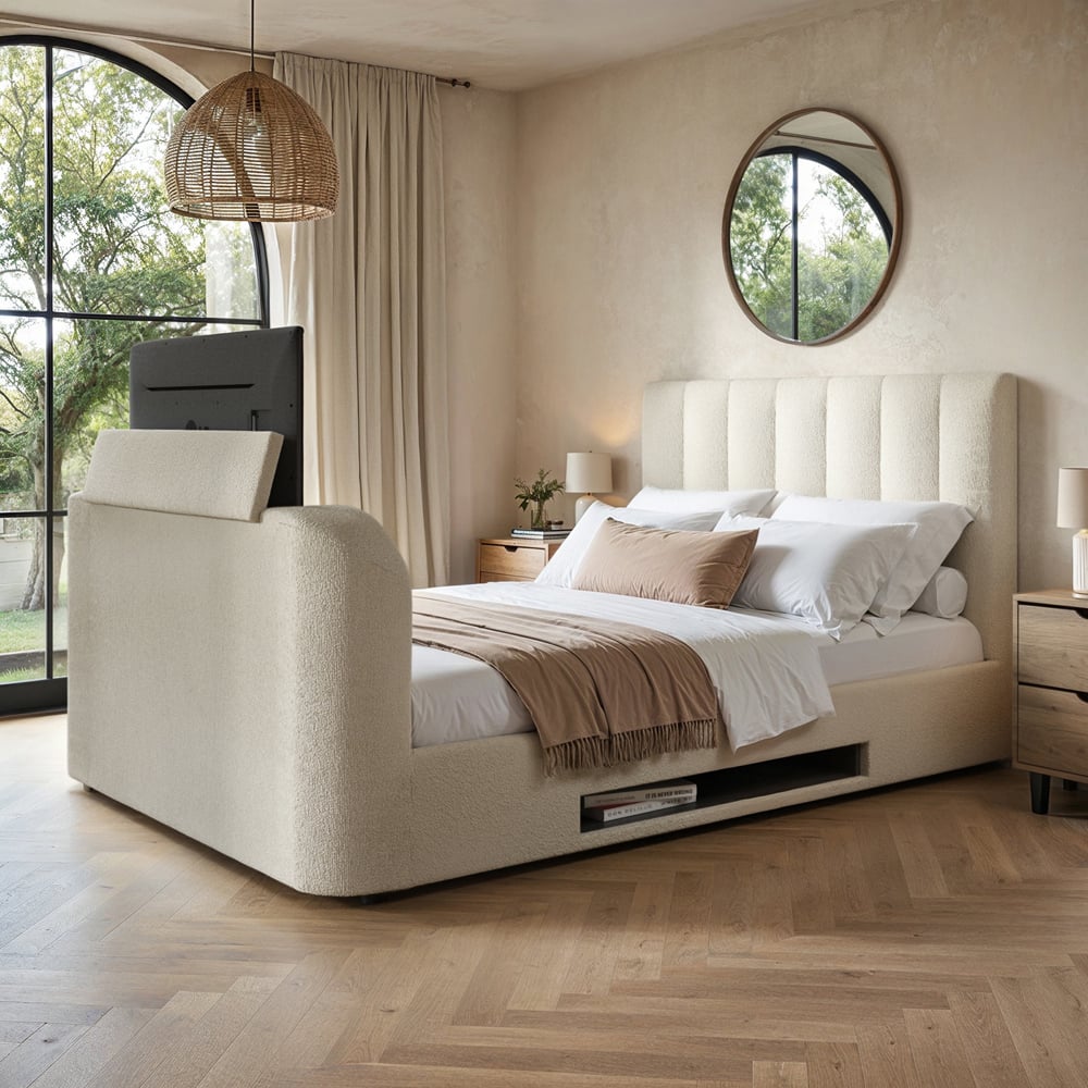Add functionality and comfort to your bedrooms with this Flair Megane Double Cream Boucle Side Lift Ottoman Bed with a TV Bracket. With its timeless design, this bed seamlessly integrates modern features into any space. Crafted from sumptuously soft Boucle material, this ottoman exudes luxury and practicality, making it a stylish and functional addition to your space. Easy to use, the side lift hydraulic ottoman mechanism reveals a hidden storage compartment, perfect for storing items to keep your space neat and organized. Also, the thoughtful design includes a ventilated ottoman base to promote airflow and maintain the freshness of your belongings. Plus, the under-bed storage shelf is skilfully designed to hide all wires and cables, maintaining a clutter-free appearance. Moreover, it even has space to accommodate a Sky box or multimedia player, providing you with a seamless entertainment experience. Note: The maximum TV size you can use is 42 inches.