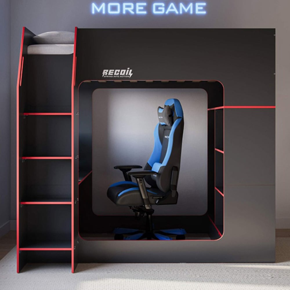 The Recoil Meridian Gaming High Sleeper is the ultimate combination of style, functionality, and space-saving design, ideal for any young gamer or student looking to maximise their bedroom space. This high sleeper bed frame offers an elevated sleeping area, leaving ample room beneath for a complete gaming setup or study station. With its bold black and red design, the Recoil Meridian adds a modern, futuristic aesthetic to any room. Key Features: Elevated Bed Design: Single bed positioned above a spacious desk area, optimising bedroom space for sleeping and productivity. Gaming-Ready Workspace: The dedicated area under the bed provides plenty of room for a gaming desk, monitors, and consoles, making it the ideal gaming station or study space. Integrated Storage: Built-in shelving along the side offers convenient storage for games, accessories, books, and personal items, keeping everything organised and within easy reach. Sturdy Construction: Made from high-quality materials to ensure durability and safety, with a secure ladder for easy access to the upper bed. Stylish Finish: Black frame with striking red accents gives a bold look that suits modern and gaming-themed bedroom décor. Space-Saving Solution: Perfect for smaller rooms, the high sleeper layout makes efficient use of vertical space, freeing up the floor area for other activities or storage.