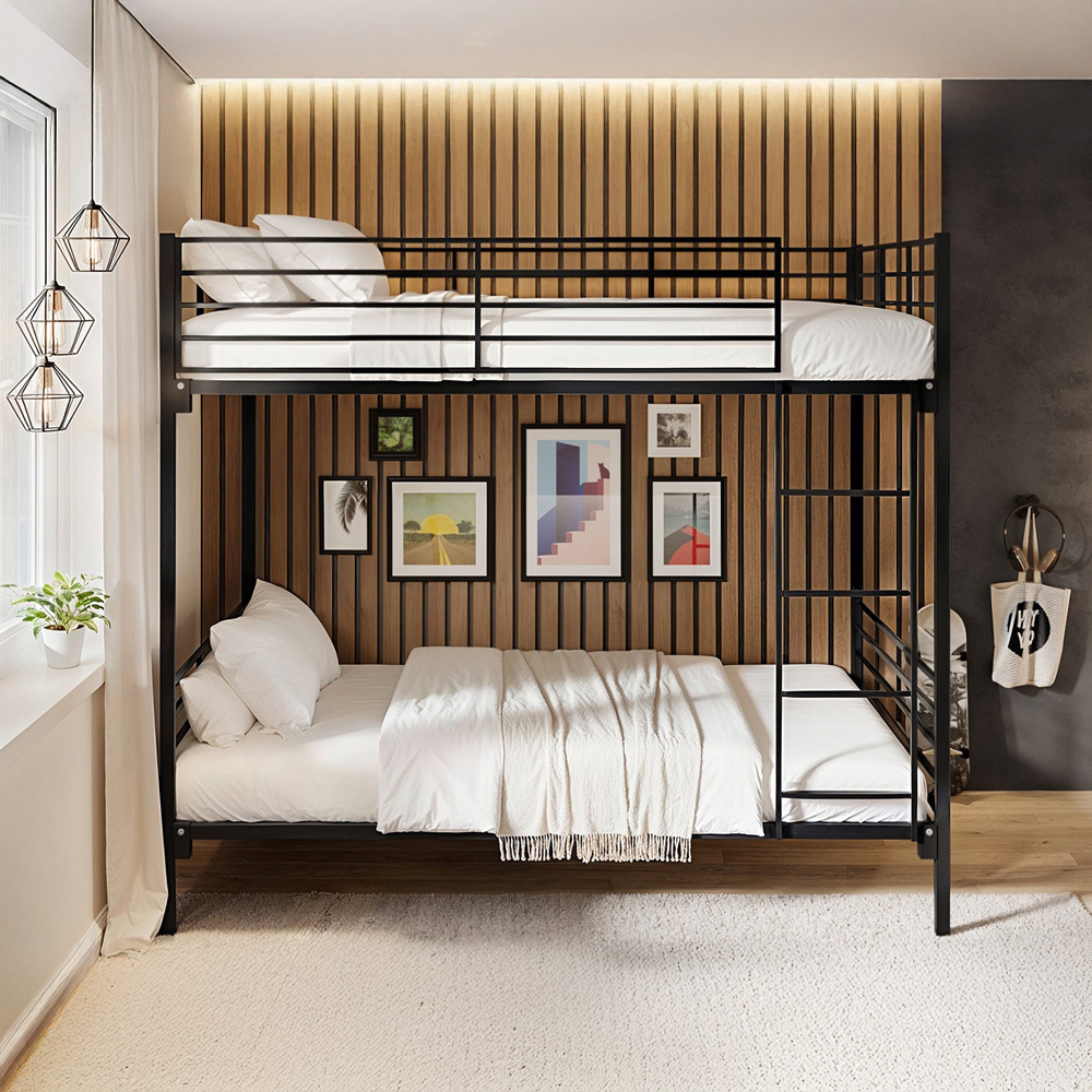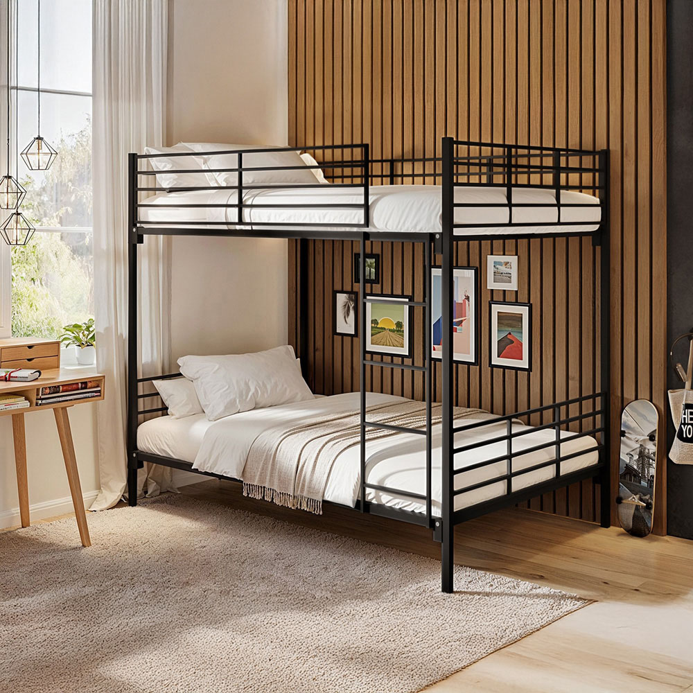 The Flair Metayal Bunk Black is a sturdy and sleek metal bunk bed, designed to provide both style and functionality in any bedroom. Finished in a smooth black, it offers a modern, industrial look that complements various interior styles. The minimalist, open structure features horizontal metal slats, ensuring durability and breathability for both the top and bottom bunks. This affordable bunk bed is perfect for holiday homes, dorms, and any other commercial spaces, making it an economical alternative to double wooden bunks. Available in two sizes: Small Double – Ideal for maximizing space in smaller rooms while providing ample sleeping area for kids or adults. Standard Double (Quad Bunk) – Offers extra room for sleeping, making it a great choice for shared bedrooms, guest rooms, or sleepovers. The integrated ladder ensures easy access to the top bunk, while the high guardrails provide safety and security for the upper sleeper. Its minimalist design allows for easy coordination with various bedding styles and room decor, making it a practical choice for both children's rooms and adult spaces. Key Features: Modern, black metal frame with a sleek industrial design. Available in Small Double or Standard Double (Quad Bunk) sizes. Sturdy ladder and guardrails for safety. Ideal for shared bedrooms, guest rooms, holiday homes, and compact spaces. Open slat design for support and mattress breathability.