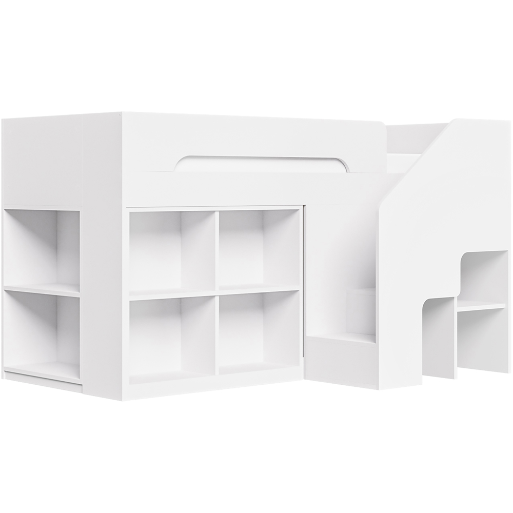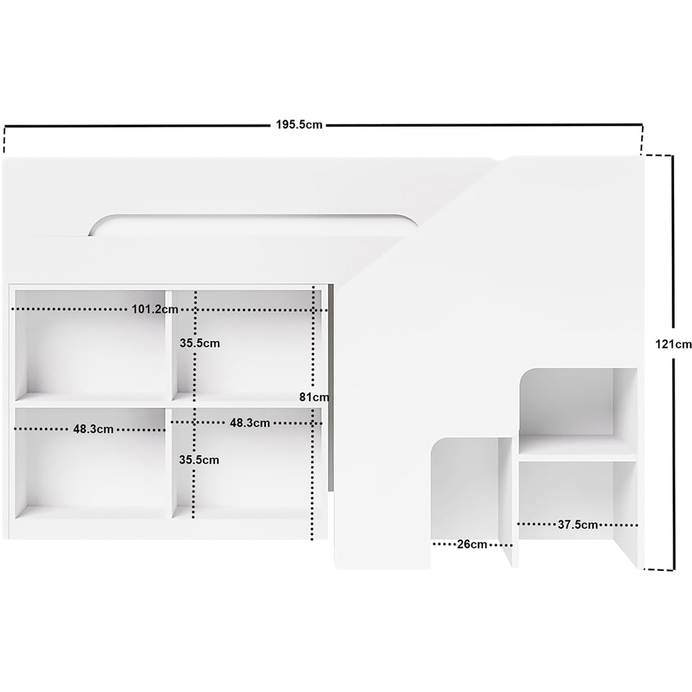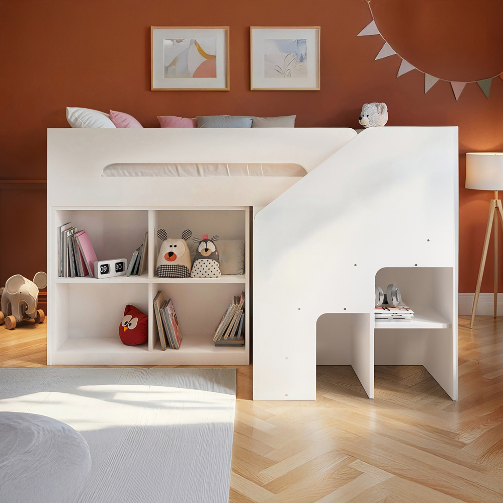 The Flair Quinn Mid Sleeper Bed with Storage is a brilliant blend of functionality and playful design, perfect for making the most of your child’s bedroom. It brings both charm and utility to any space. This cleverly designed mid-sleeper maximises floor space while offering smart storage solutions. With open shelving ideal for displaying books, toys, and treasures, plus two integrated hanging rails to neatly store clothes, it keeps everything organised and within easy reach. The sturdy staircase provides safe and easy access to the elevated sleeping area, while also adding a stylish touch.