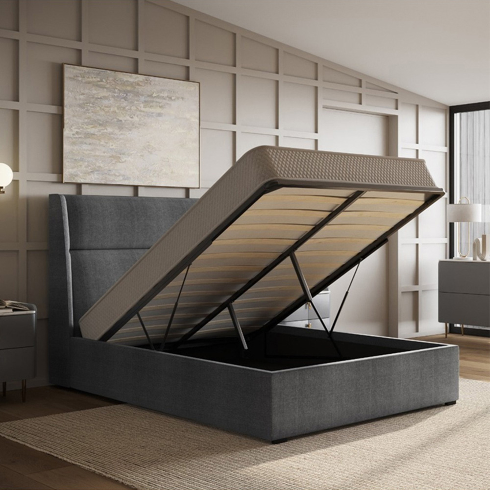 The Rumba Fabric Ottoman bed frame is an exciting addition to the Flair Furnishings range. A beautiful contemporary-styled bed frame featuring a comfortable cushioned winged headboard and a low foot end that will enhance the feeling of space in the room. The Rumba will be your bedroom's focal point, and the high-quality grey fabric upholstery will work well with most design schemes. This fabulous bed looks fantastic and practical, with excellent storage space underneath, perfect for storing bedding and accessories. The under-bed compartment is quick and easy to access with the help of a gas lift mechanism. The Rumba has a sprung slatted base that will work with the mattress to create a comfortable, supportive feel. The wooden slats have a natural bounce and will adjust to your profile where you exert the most pressure.