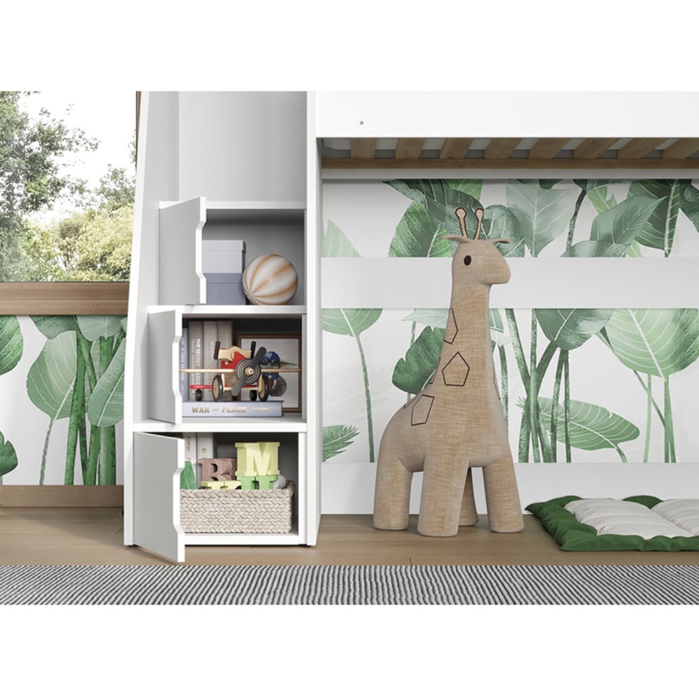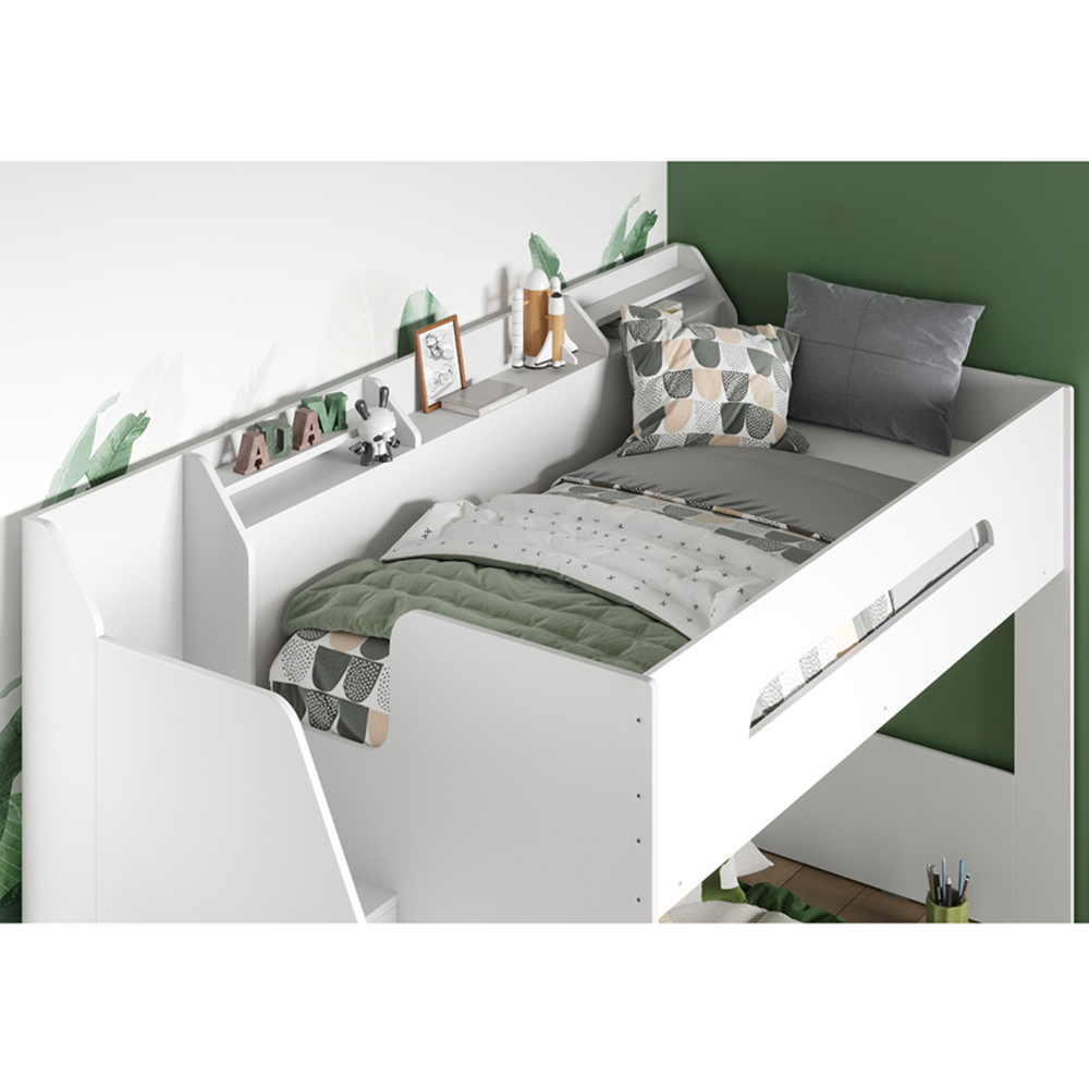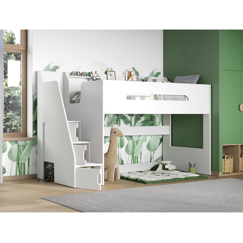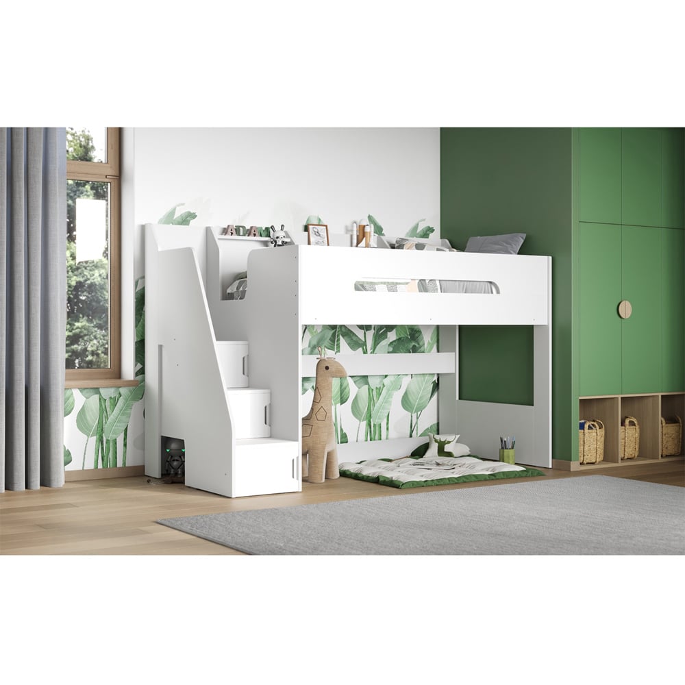 Elevate your child's bedroom decor with this Flair Stepaside White High Sleeper. This is a beautifully crafted high-sleeper frame designed to meet the needs of little ones. Crafted with safety in mind, this high sleeper comes with raised side panels for a snug and comfortable night's sleep. Also, the wide steps ensure excellent foot stability whilst ascending or descending the staircase. Perfect for decluttering your space, the wide-stepped stairs double as storage cabinets to maximise space. Also, on top is an expertly crafted shelf that can store little bits and bobs or toys. Note: Frame only.