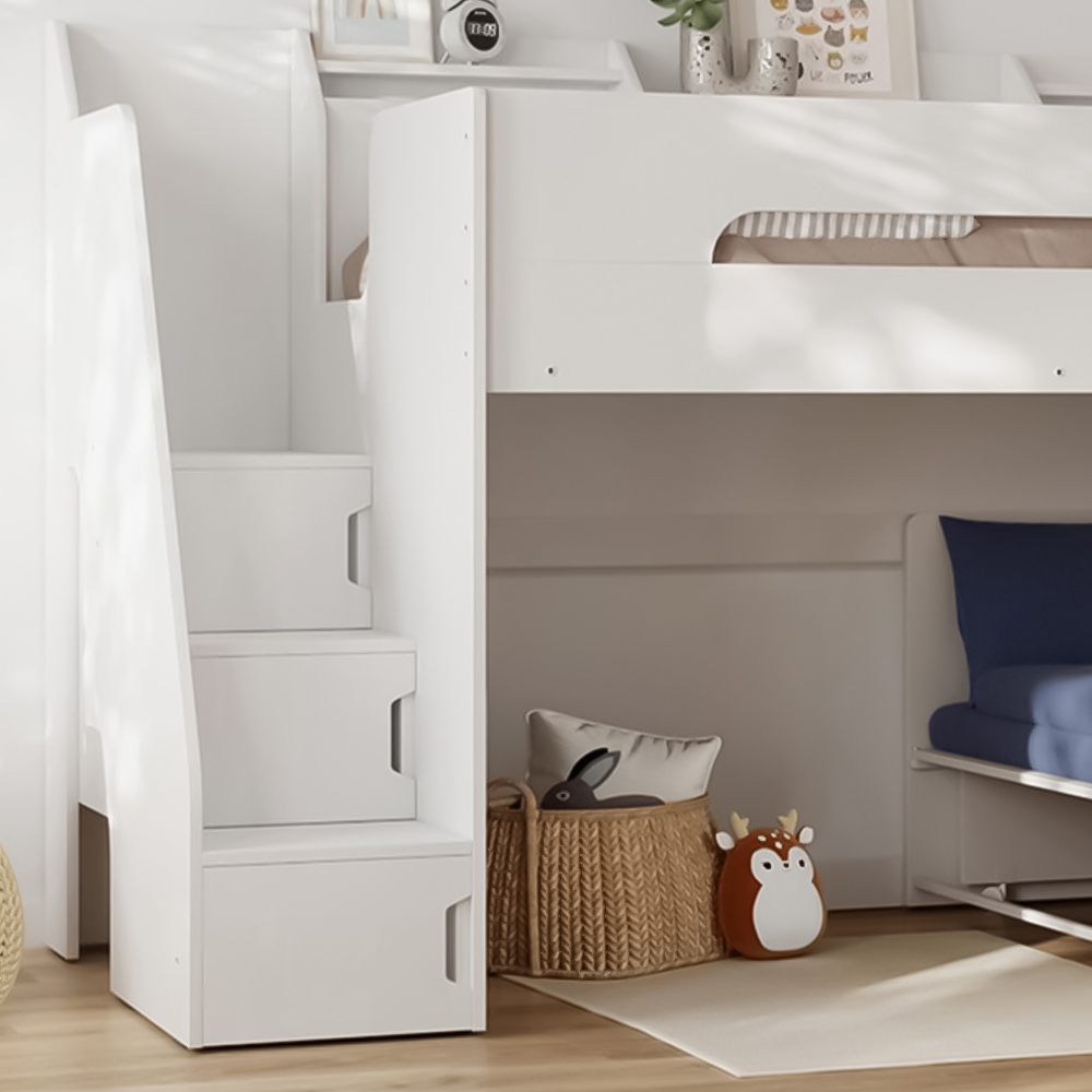 Make a versatile addition to your child's bedroom with this Flair Stepaside Staircase White High Sleeper with Navy Blue Futon. This beautifully crafted high sleeper frame is built from a solid and sturdy particle board. Designed with safety in mind, it has wide-stepped stairs that also double as storage cabinets to maximise space. Ensuring safe use, the wide steps offer excellent foot stability whilst ascending or descending the staircase, alongside raised side panels for a snug and comfortable night's sleep. Also, this staircase is much more secure than a regular laddered bunk bed. It also features an additional extendable futon with cushions and an expertly crafted shelf, which can store little bits and bobs or perhaps your favourite teddy bear.