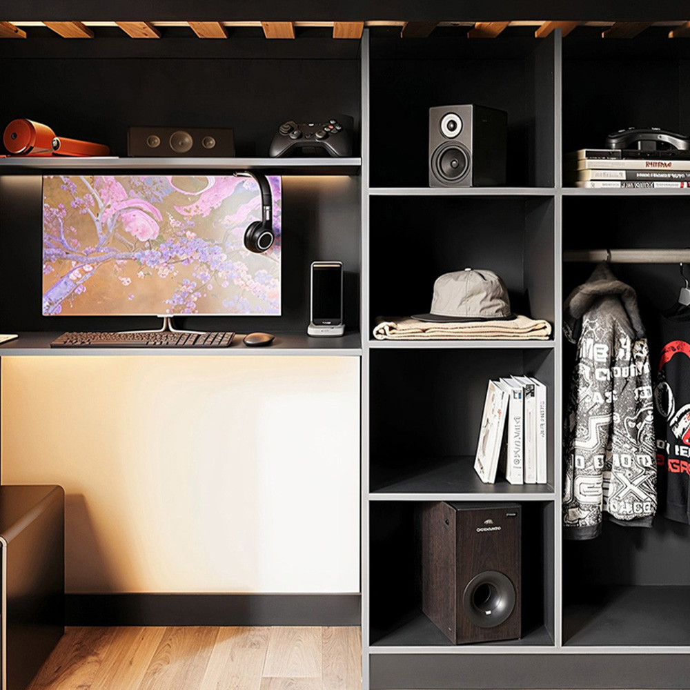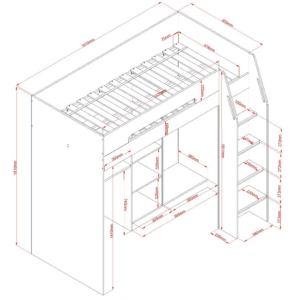 - Includes storage, wardrobe and desk