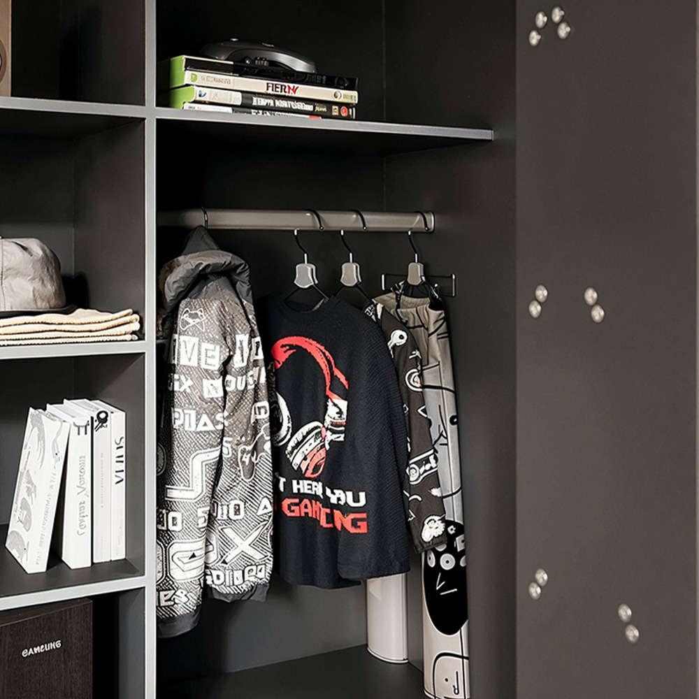 The Recoil Summit Gaming High Sleeper is designed for the ultimate gaming setup, combining a loft bed with a built-in workspace and storage. This high sleeper is perfect for maximising space in smaller rooms, with a raised bed above and a gaming station underneath. The built-in desk beneath the bed is spacious enough to accommodate a monitor, gaming console, and other tech essentials, creating the perfect environment for immersive gaming sessions. There are multiple shelves and compartments, providing plenty of storage for games, equipment, or personal items, and a wardrobe section to keep everything organised. The side ladder allows easy access to the top bunk, while the high guardrails ensure safety during sleep. This gaming high sleeper is available in two stylish designs: Black and Red – Featuring bold red accents inside the shelving and ladder, giving it a striking, dynamic look. Black and Grey – A sleek, monochromatic design perfect for a minimalist or modern gaming room. Key Features: Integrated desk and storage space for an efficient gaming setup. Available in black or black with red accents. Sturdy ladder and high guardrails for safety. Multiple shelves and a wardrobe section for storage. Space-saving design, ideal for smaller rooms