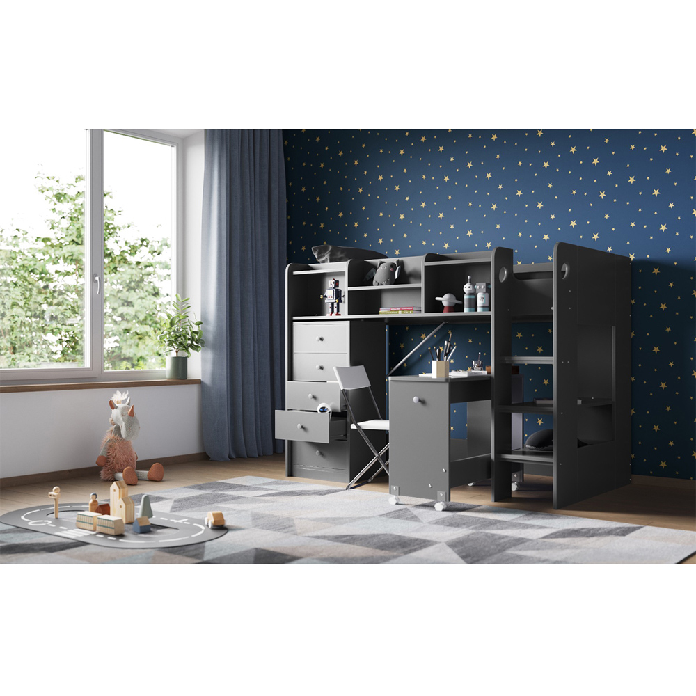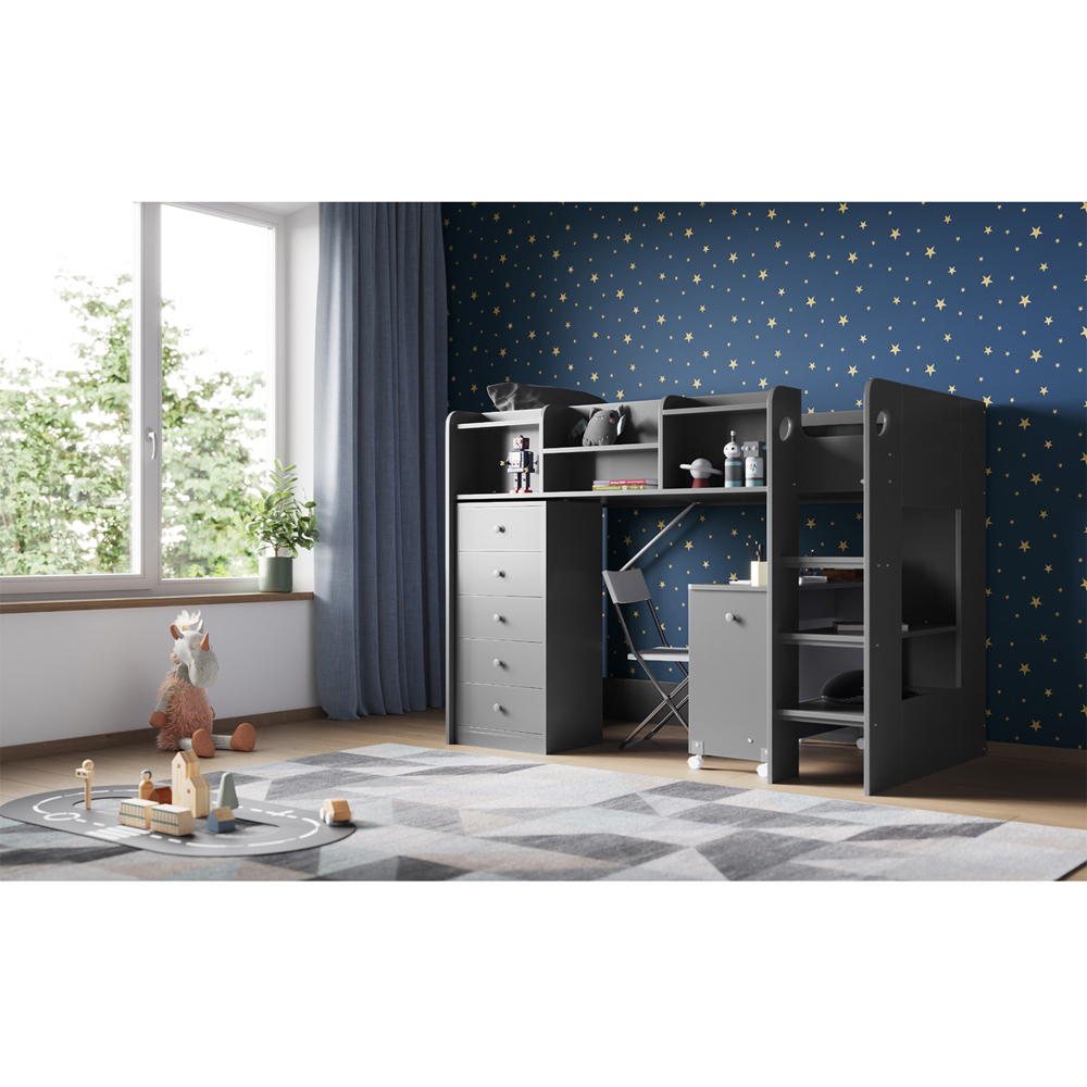 Make a cosy sleeping space with the Flair Wizard Single Grey Cabin Station Junior High Sleeper. For people who wish to save space in their smaller bedrooms, this set is the ideal choice. Safety was the primary consideration in the design of the chest of drawers, storage unit, and high-sleeper bed. Wide steps and cosy handles make climbing the high sleeper simple and stable. With five roomy drawers that offer plenty of storage space, the chest of drawers fits neatly beneath the bunk. You can also arrange the chest in any location in your bedroom, giving you extra room underneath the bed for play or other activities. This is a useful feature for smaller bedrooms where every square inch matters. You can easily rearrange your space and make the most of your available area with our furniture.