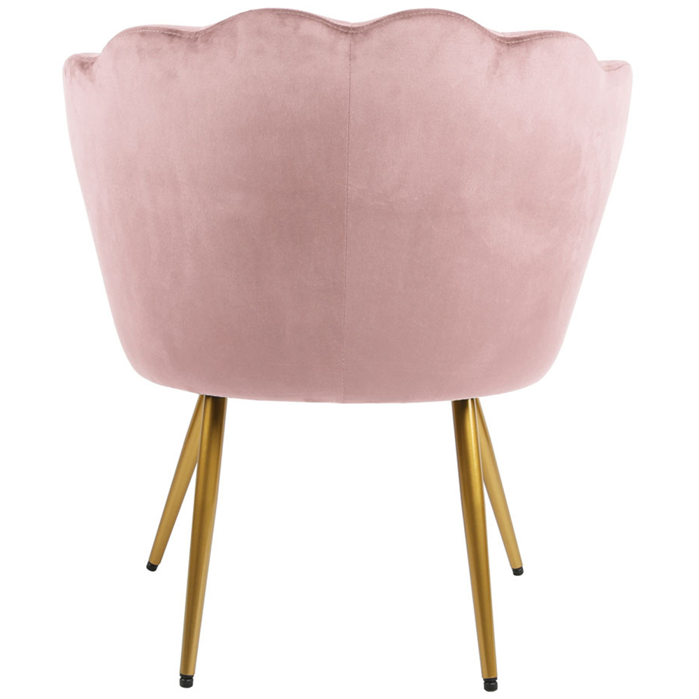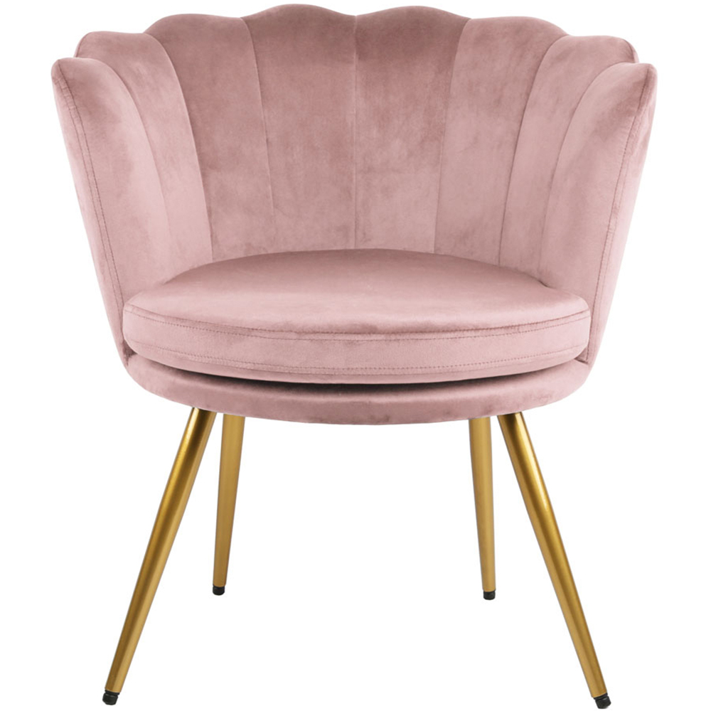 Find blissful comfort in style with the Flora Pink Velvet Scalloped Back Accent Chair. This chair with its petal scallop back design in velvet is a stylish and elegant accent for any modern home. Combining graceful curves with unique patterns, this chair brings a touch of floral-inspired charm. Built on a rust-resistant metal frame with gold-coated legs, it offers both durability and a touch of luxury. Perfect for the living room or bedroom, this chair provides a plush feel you will love to sink into. Upholstered in soft, pink velvet, it features a scalloped shell back design for a beautiful and inviting look. Made from velvet and sponge, it combines comfort and style effortlessly.