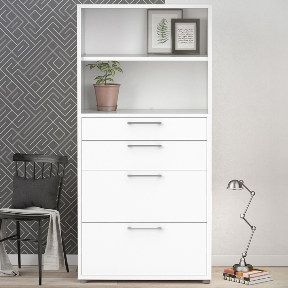 Upgrade your living space with the Florence 4 Drawer White Bookcase. Crafted from high-quality laminated board, the bookcase is built to withstand daily wear and tear, ensuring durability and longevity. Designed with versatility in mind, the bookcase is ideal for small spaces, maximising your available floor area. With its timeless and stylish design, this bookcase adds a touch of elegance to any room decor.