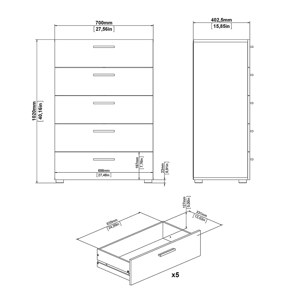 Florence 5 Drawer Oak and White High Gloss Chest of Drawers