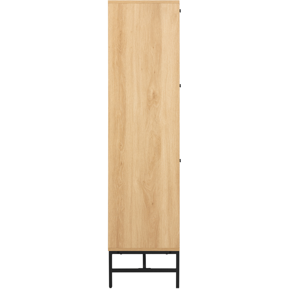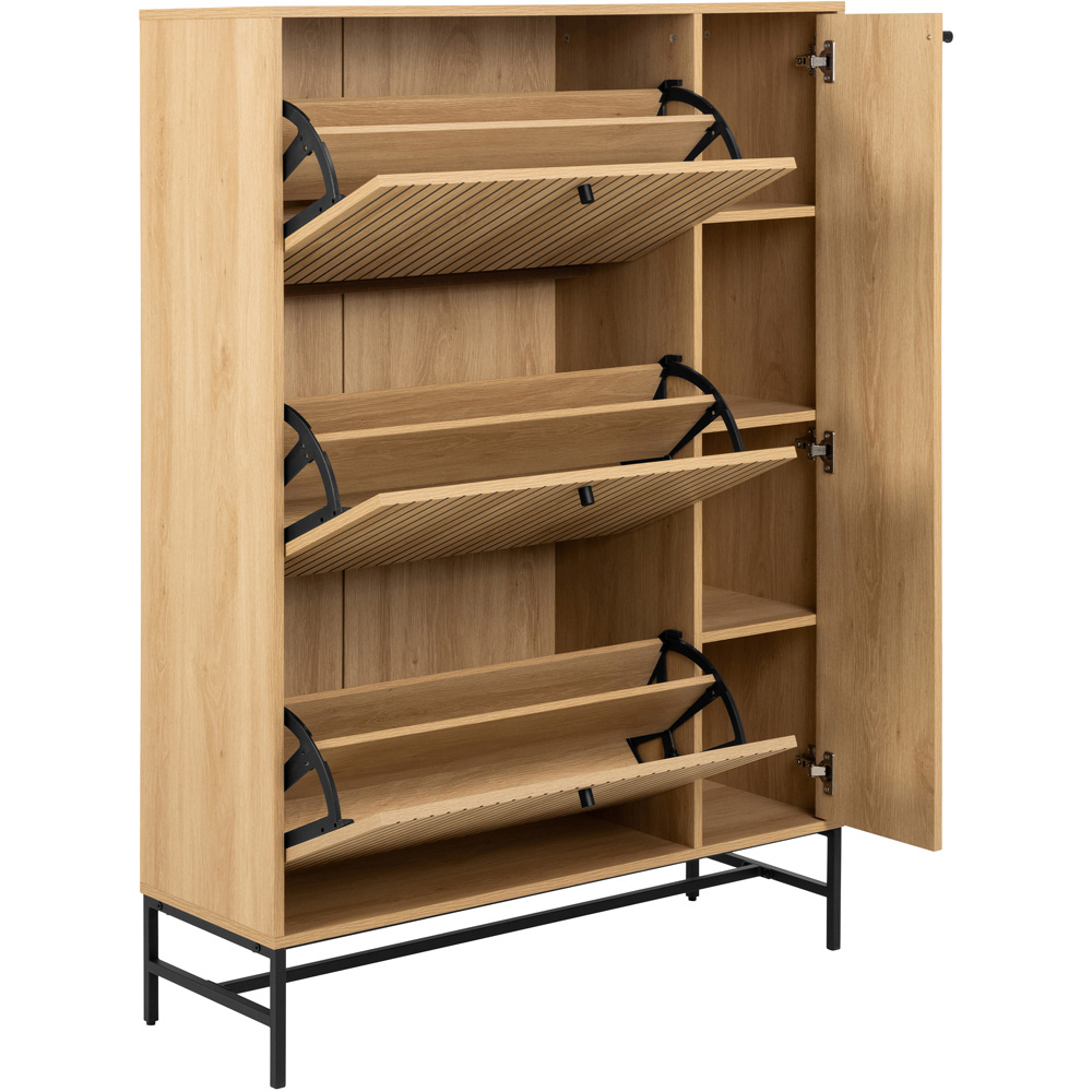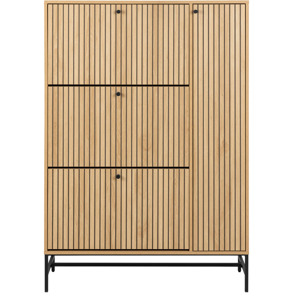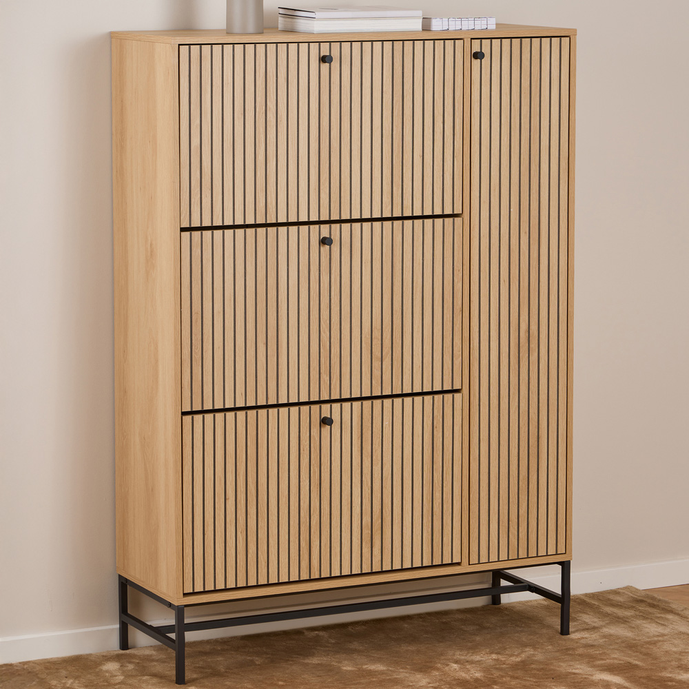 The Albany shoe cabinet blends functionality with modern design. Crafted from oak rough melamine, it features a frame with three drawers and three shelves, providing ample space for shoes and accessories. The distinctive lamella fronts add texture, while the black powder-coated steel base offers a bold industrial touch. Measuring 98.7 x 35 x 140.4cm, this stylish cabinet is perfect for organising footwear while enhancing any hallway or entryway with its contemporary aesthetic.