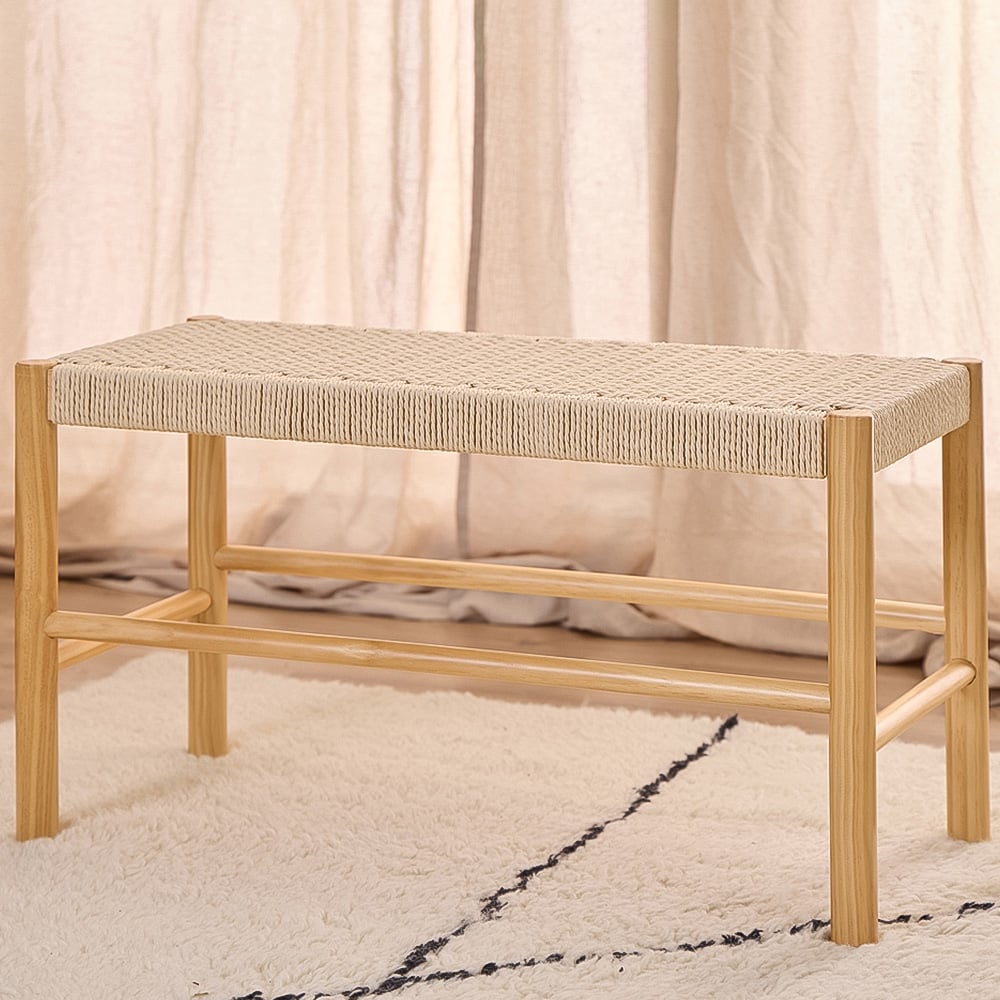 The Alvin bench combines comfort and style with its off-white paper plaits seat, interwoven with a durable paper cord for a unique, textured look. The frame is crafted from NC lacquered pine, offering a sleek and sturdy base. Measuring 80x35x45 cm, this bench comfortably seats two people, making it a perfect addition to entryways, living rooms, or dining areas. Its weaved pattern and natural materials bring both elegance and practicality to any space.