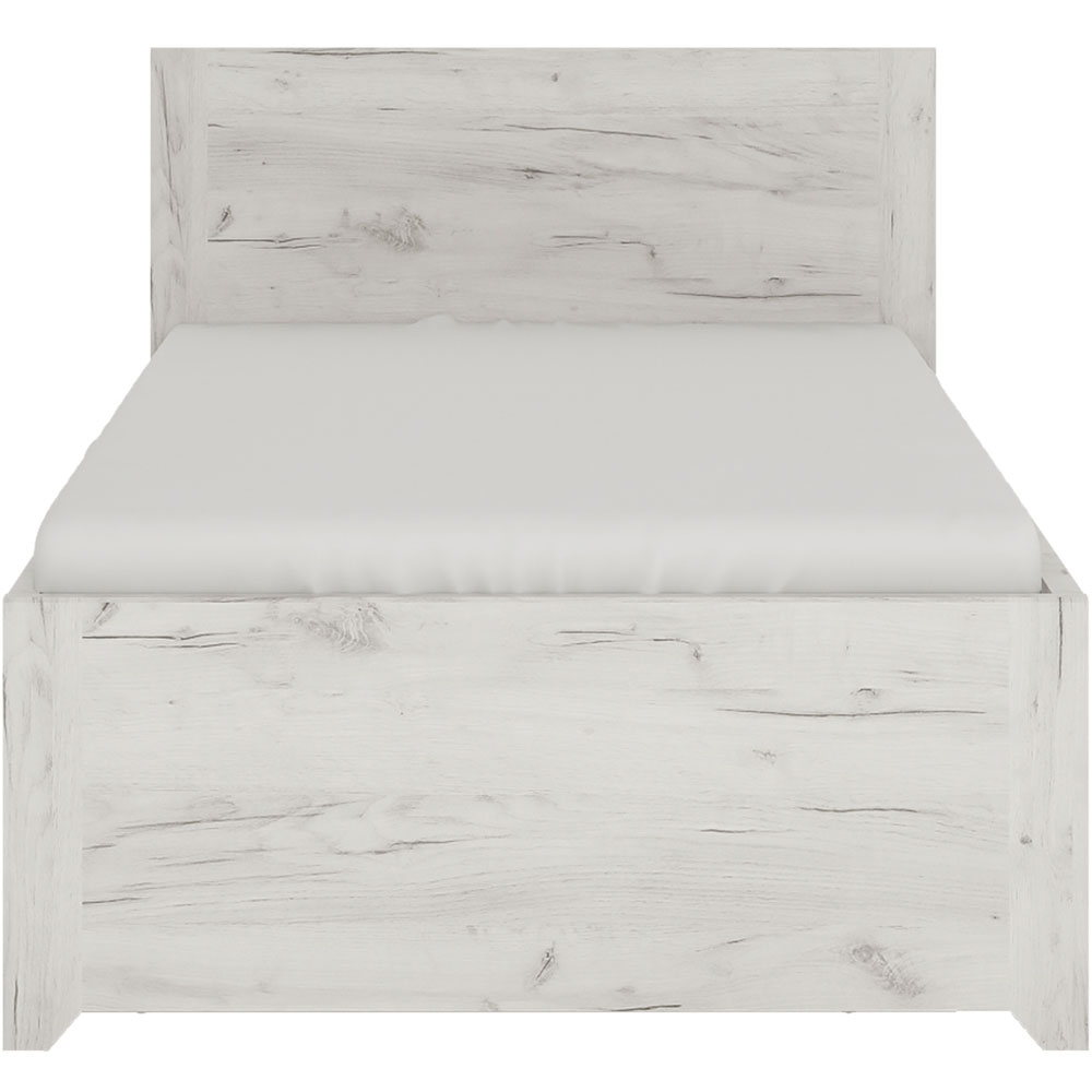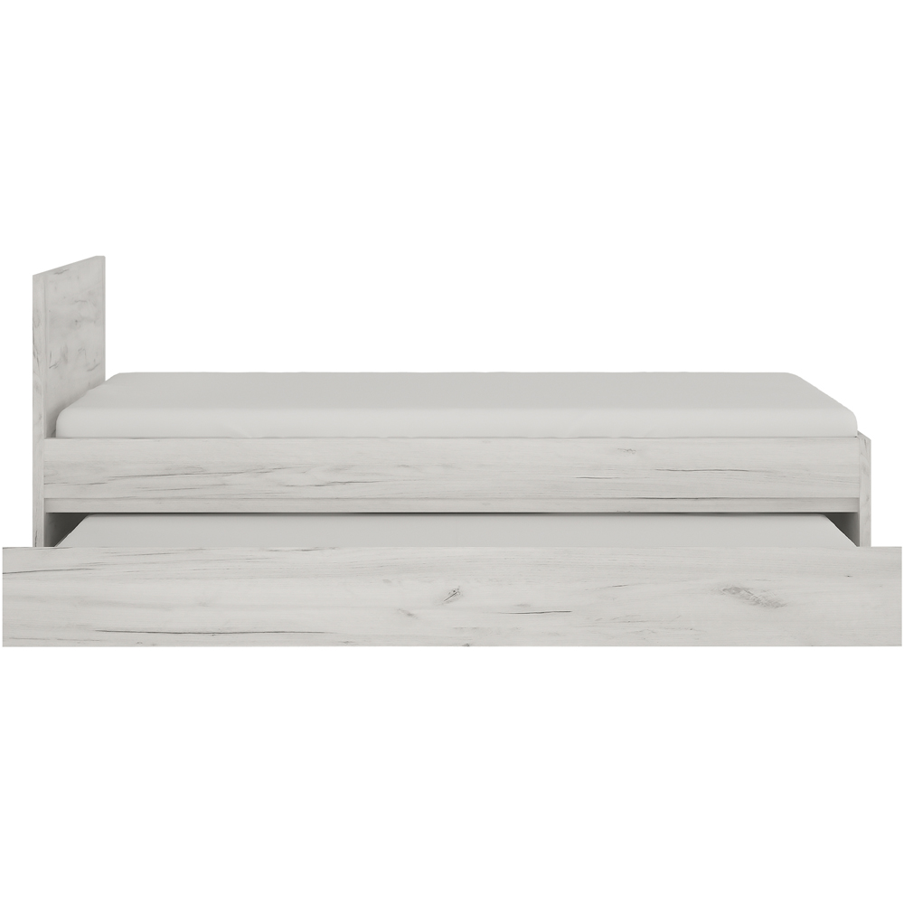 Transform your home into a haven of comfort with this Furniture To Go Angel Single Bed with Underbed Drawer. This stunning bedroom collection boasts a contemporary and stylish design that is perfect for all age groups. It features a single bed that is generously sized to accommodate a 90 x 200cm mattress. The bed is crafted from a modern hard-wearing white oak melamine that is both durable and long-lasting, making it an excellent investment for your home. In addition, the bed comes with an under-bed drawer that can be used to store various items, including a spare mattress, thanks to its robust construction. The bed is made from laminated board which is highly resistant to damage, scratches, moisture, and high temperatures, ensuring that it stays looking great for years to come. The bed's decorative gently rounded MDF mouldings add a touch of elegance to its overall design. Finally, the bed is easy to assemble, making it a hassle-free addition to any bedroom.