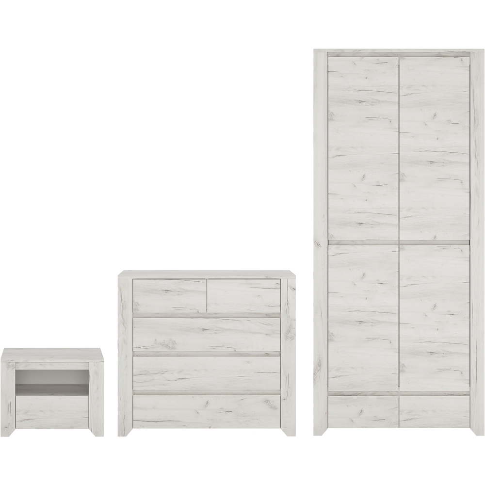 This beautiful bedroom collection is contemporary and stylish and suitable for all age groups, finished in a modern white crafted Oak melamine. This package includes a 1 drawer bedside, 5 drawer chest of drawers and a 2 door 2 drawer wardrobe. Bedside: W 49.1 x H 37.6 x D 40 cm. Chest: W 84 x H 76.5 x D 40 cm. Wardrobe: W 147.2 x H 200.1 D 58.1 cm.