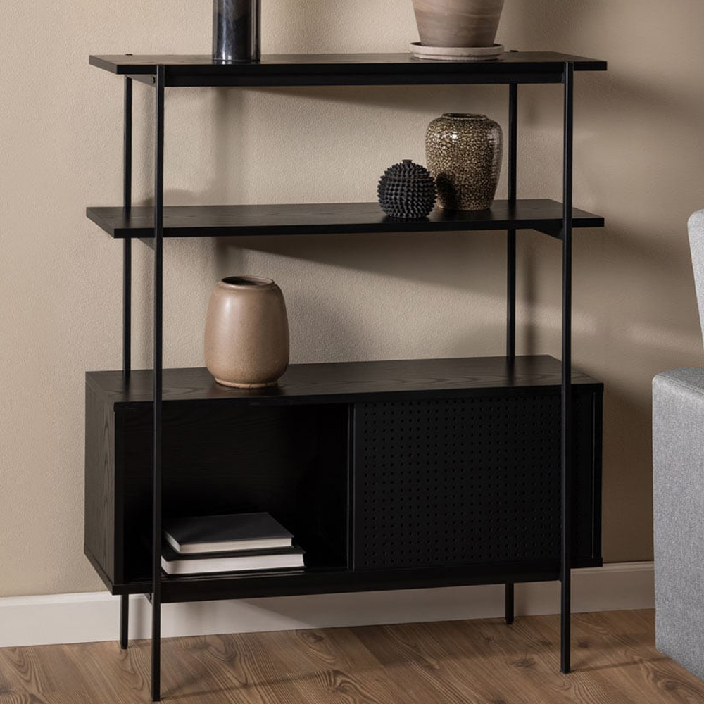 Featuring clean lines and a lightweight design, this wall unit epitomizes contemporary living, seamlessly blending with any interior style. Supported by a powder-coated metal frame, the melamine shelves in a black ash finish provide both style and durability. Conceal belongings behind the sliding doors for a clutter-free space. Let this modern wall unit become the focal point of your living area.