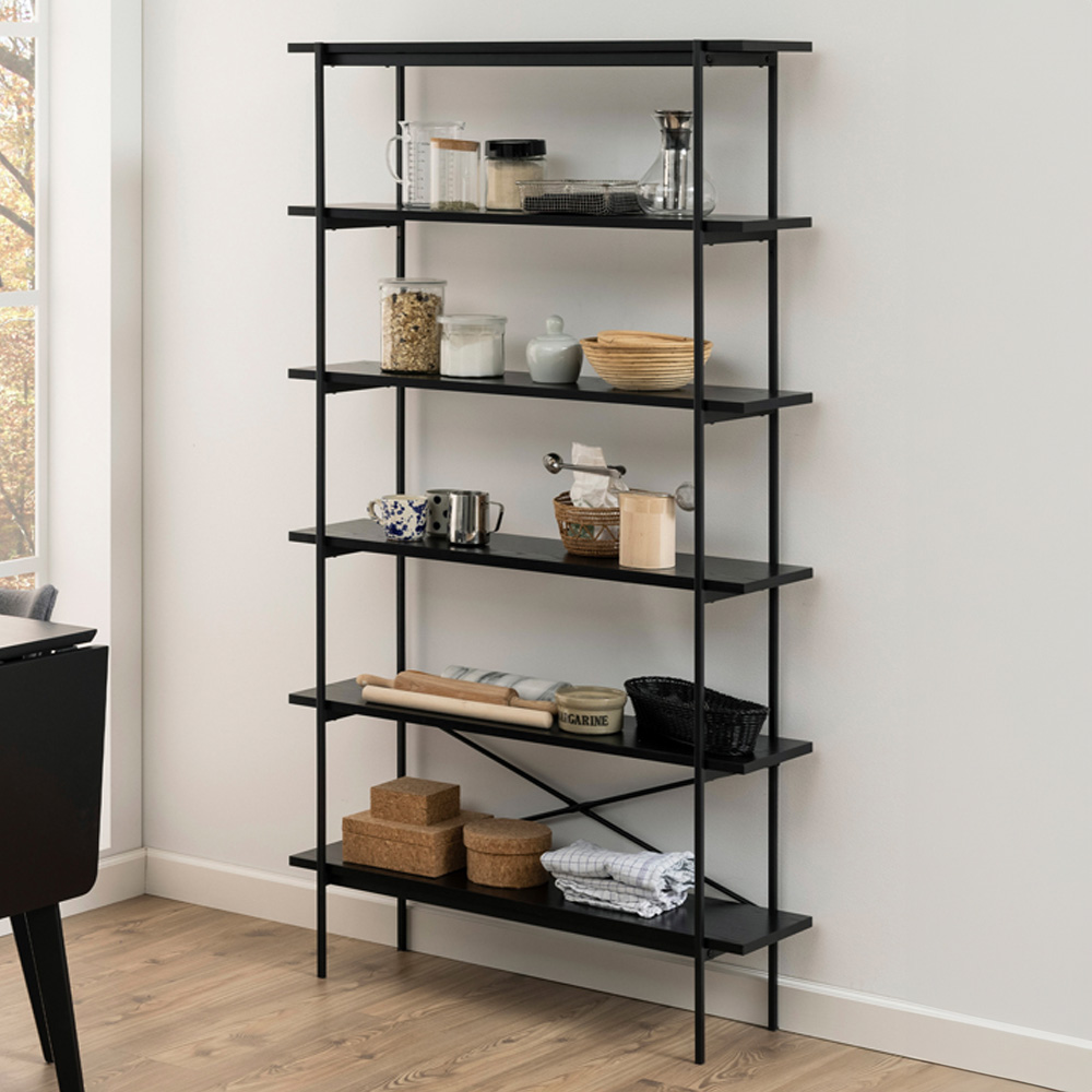 With its clean lines and airy build, this wall unit brings a modern touch to any home decor. Featuring five shelves in sleek black ash, it provides ample storage space. The rugged powder-coated metal legs add a finishing touch to its contemporary aesthetic.