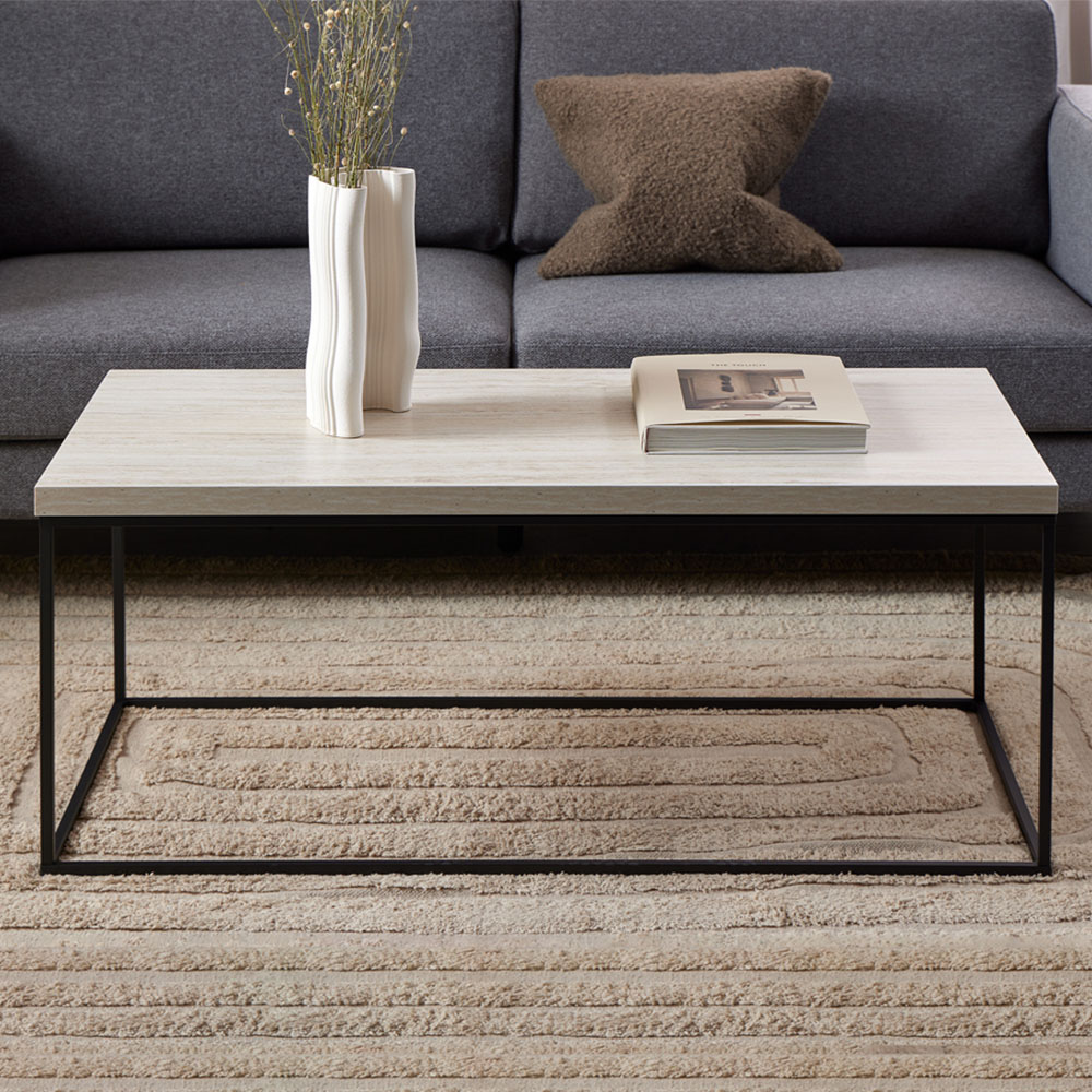 Enhance your living space with a rectangular coffee table that pairs a sophisticated travertine stone effect top with a sleek matt black steel base, designed to complement contemporary interiors.