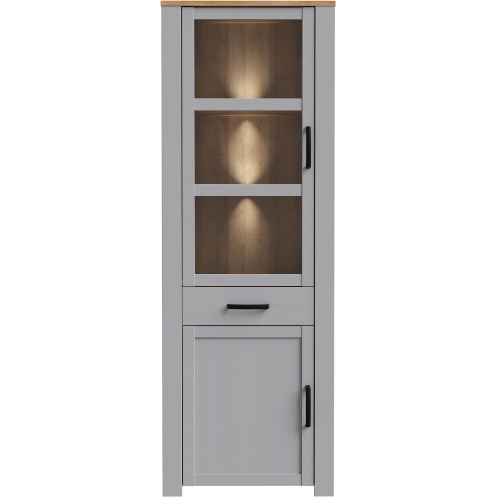 The Bohol 2-Door 1-Drawer Narrow Display Cabinet combines rustic charm with modern practicality. Featuring black handles, soft-close doors, and LED lighting, it offers a perfect blend of elegance and function. Available in Navy & Oak or Grey & Oak, this sleek cabinet is a standout addition to any living space.