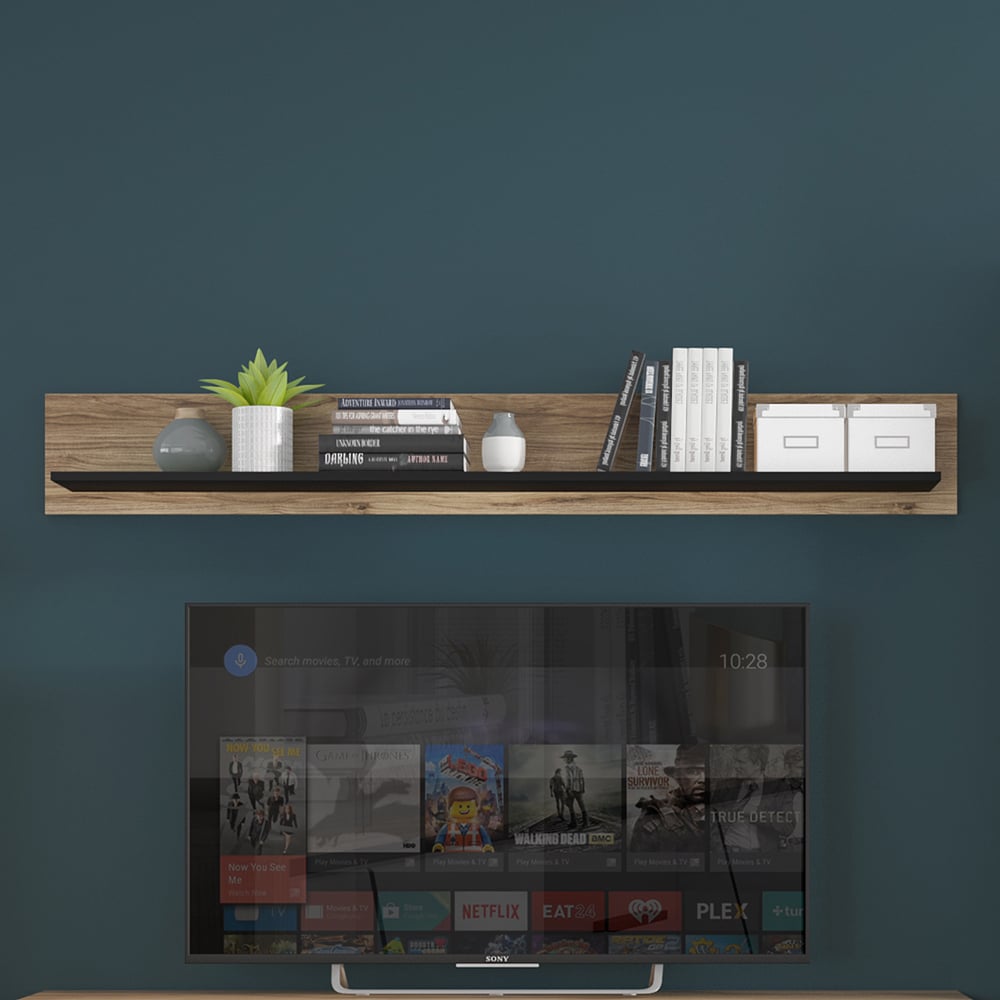 Add classiness to your living space with this Brolo Wall Shelf by Furniture to Go. Its timeless charm and rustic style can uplift your home decor. Its traditional design features one shelf, offering convenient storage space to place decorative items. It is made from laminated board and is easily mounted on the wall. This 167cm wall shelf also has a walnut effect and dark panel finish to enhance your walls.