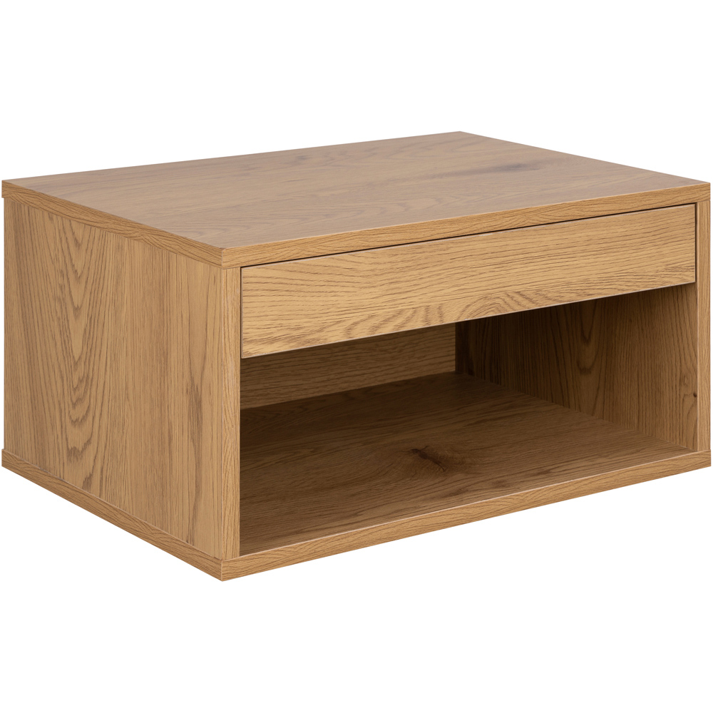 Enhance your bedroom's convenience and style with this square bedside table. It features a top, drawer, and shelf finished in matt wild oak effect, complete with smooth metal runners for full extension. The design includes an open compartment and is suitable for wall mounting, blending functionality with a modern aesthetic.