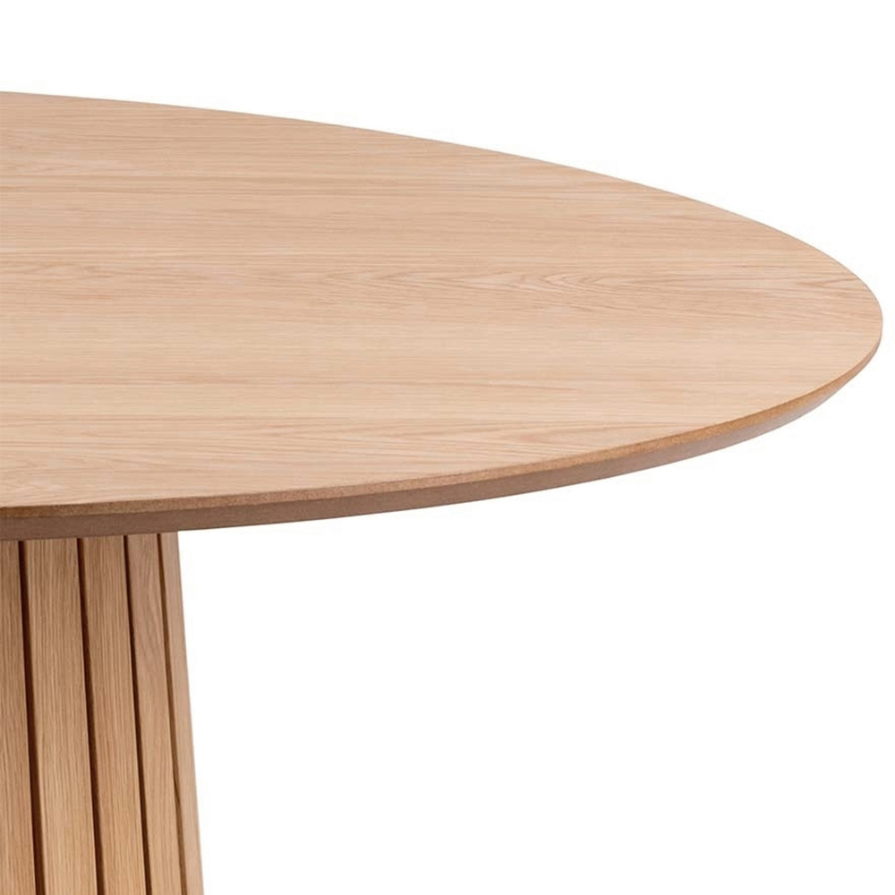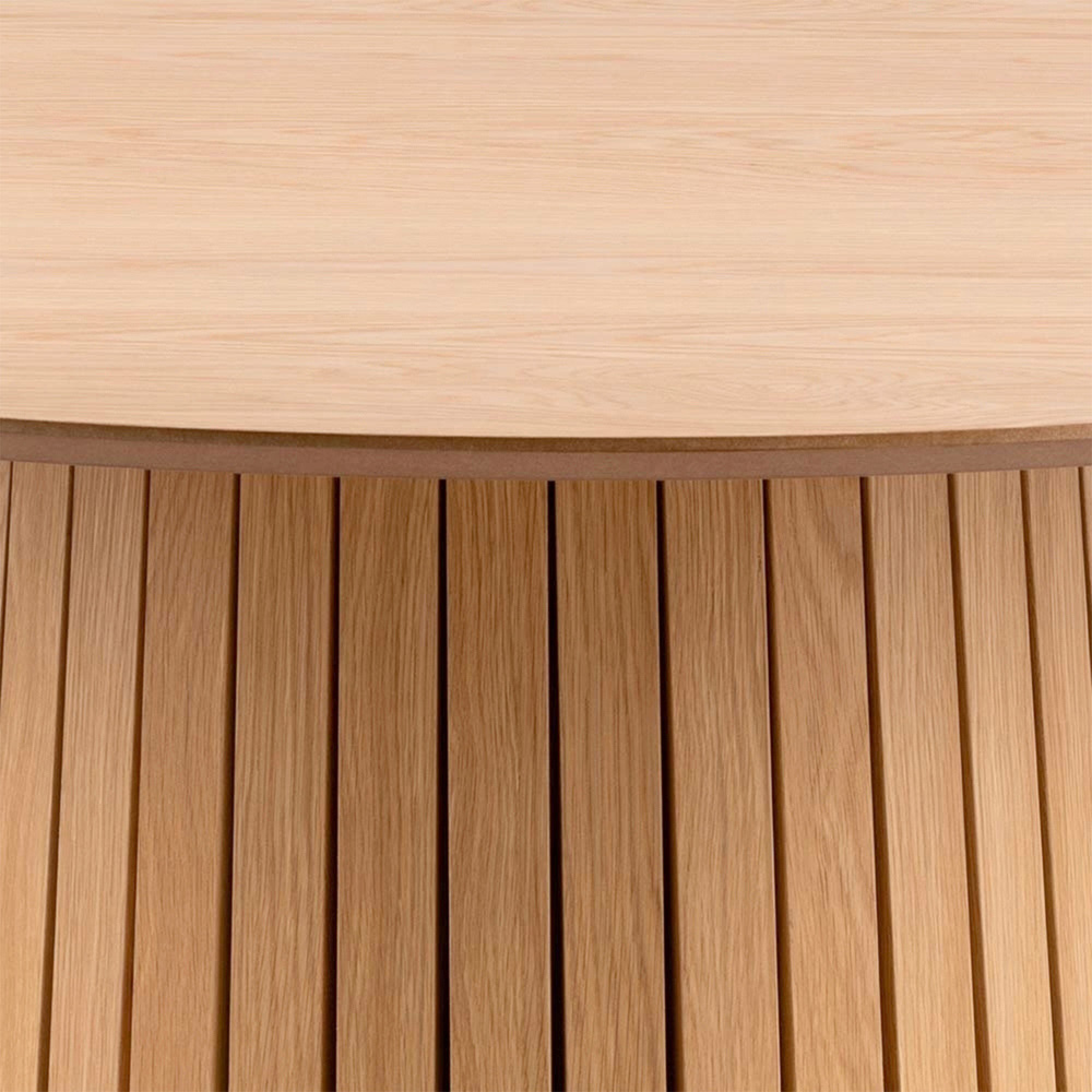 Enjoy delightful dining with this round, matt oak veneer table for 4. Its conic slat base adds warmth and sunray-like aesthetics to your dining room.