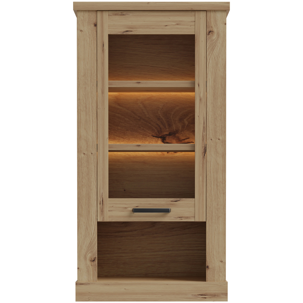 Explore the captivating allure of the Corona Display Cabinet, where practicality meets sophistication. This cabinet is excellent if you are looking to build or find storage solutions for your home, providing secure and stylish storage solutions with high-quality furniture. Crafted from high-quality materials, the furniture showcases a traditional design in a light artisan oak effect, complete with one glass door.