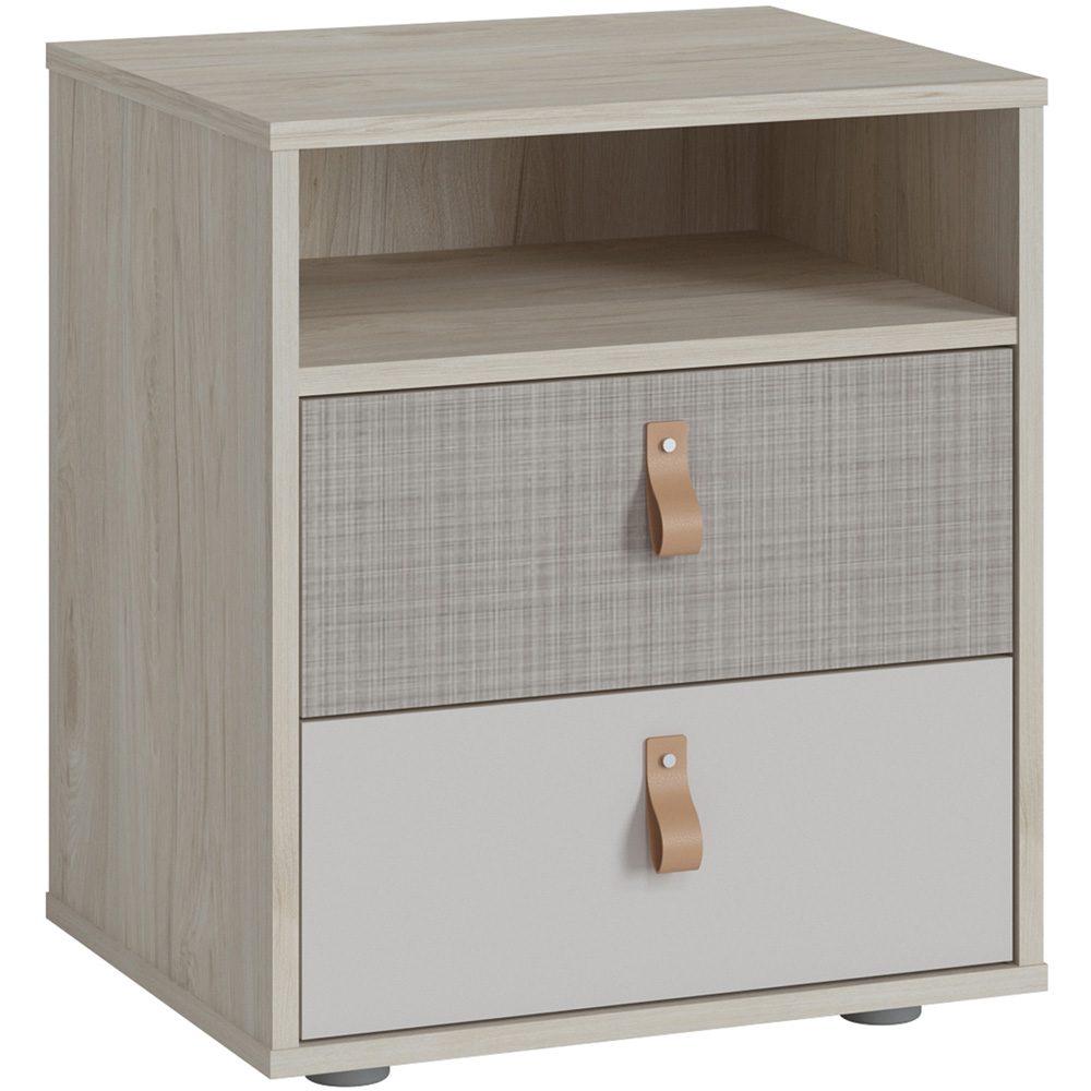 Add elegance to your living space with this Denim Bedside Cabinet by Furniture To Go. This light walnut-coloured cabinet is characterized by its functionality and modern design. It features two Drawers and one spacious shelf complemented by stylish leather handles. The furniture is made of high-quality laminated chipboard, resistant to damage. Its body and open shelf are kept in a timeless shade of light wood (the colour of Rockford Walnut Light), while the drawer fronts present a fashionable and timeless grey tone (Cashmere and Caroline colours). The drawers have ball-bearing slides with full extension and easy-to-use leather handles. Due to its small dimensions, the cabinet fits even into a small room.
