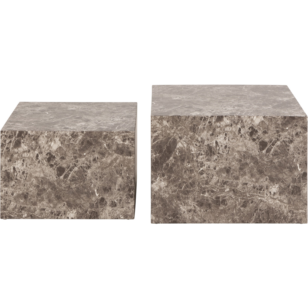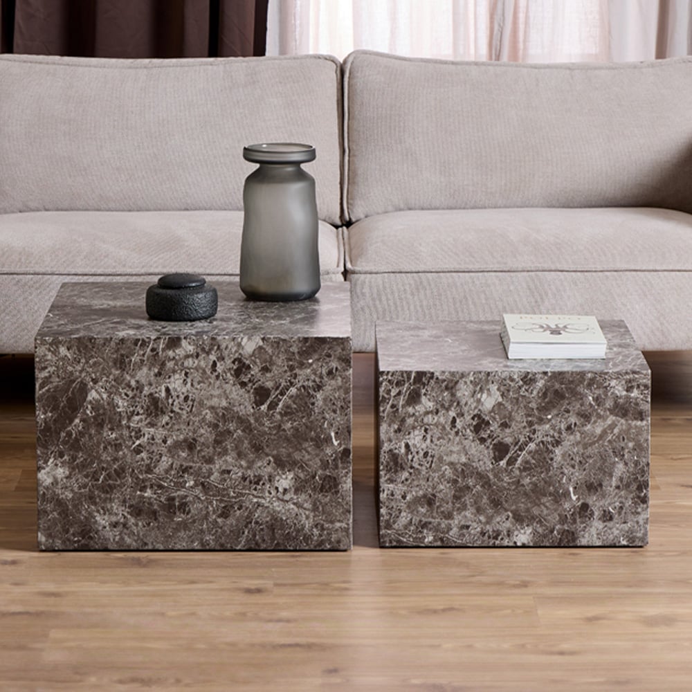 The Dice square coffee table set brings modern elegance to your living space, featuring a light brown Emperador rough paper top and base. The set includes two tables, offering versatile design options for various setups. This coffee table set adds a sophisticated touch while providing flexibility for your décor needs.