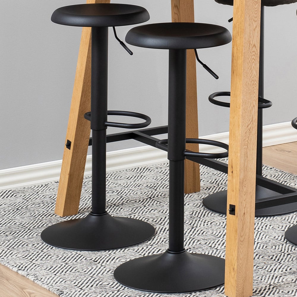 Revitalize your space with this pair of sleek bar stools, featuring a smooth swivel and gas lift for adjustable comfort. The trumpet base in matte black powder-coated steel ensures stability with a modern edge, perfect for any contemporary setting.