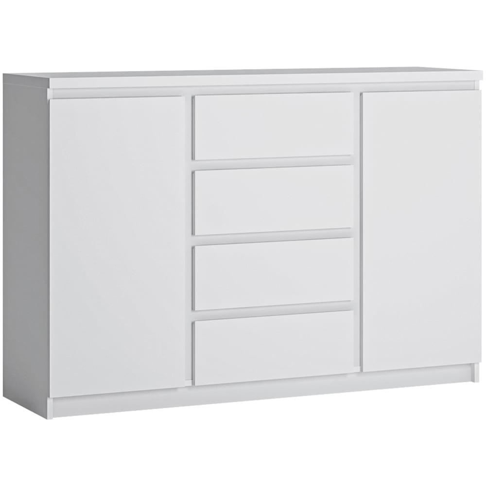 Declutter and organise your space with this Florence Fribo 2-Door 4-Drawer White Sideboard. This unit comes with four drawers equipped with a full extension system and shelves in a closed space. Featuring a geometric shape, this unit will work well in interiors decorated in a minimalist or modern style, thanks to its simple form. Also, you can combine it with matching elements to stylise your interiors. For added convenience, this chest of drawers is equipped with an ergonomic handle-free system for comfortable use. Plus, sturdy and durable, the furniture is made of laminated chipboard, resistant to moisture, scratches, damage and high temperature.