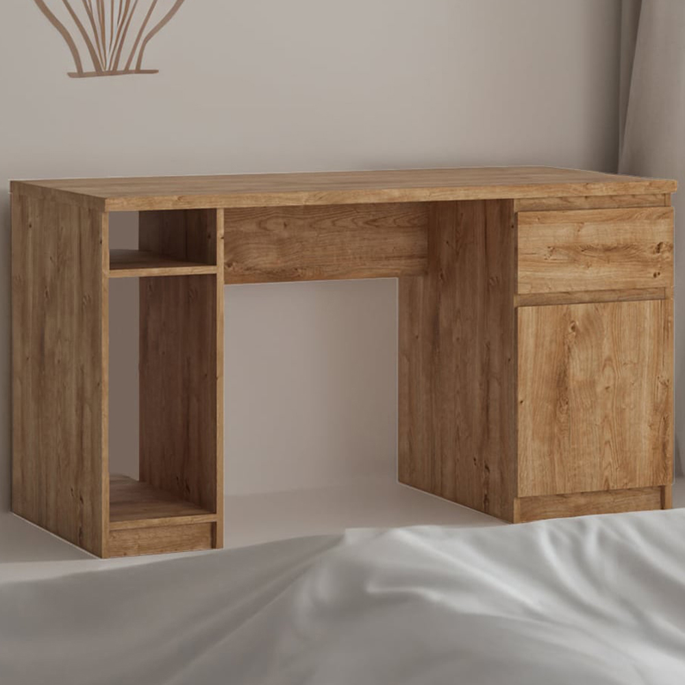 The Florence Fribo 1 Door 1 Drawer Oak Twin Pedestal Desk offers a contemporary and sleek design that is perfect for creating a functional office space in your living room. Its minimalist form adds a touch of simplicity to your interior, while maintaining a sense of harmony in your home. With its practical interior, including a full extension drawer, a cupboard, and open shelves, you'll have ample storage space for all your office essentials. Made from laminated chipboard, this desk is highly durable and resistant to damage, scratches, moisture, and high temperatures, ensuring its longevity for years to come. The desk features a handle-free system for a seamless look and concealed hinges for a clean and polished finish.