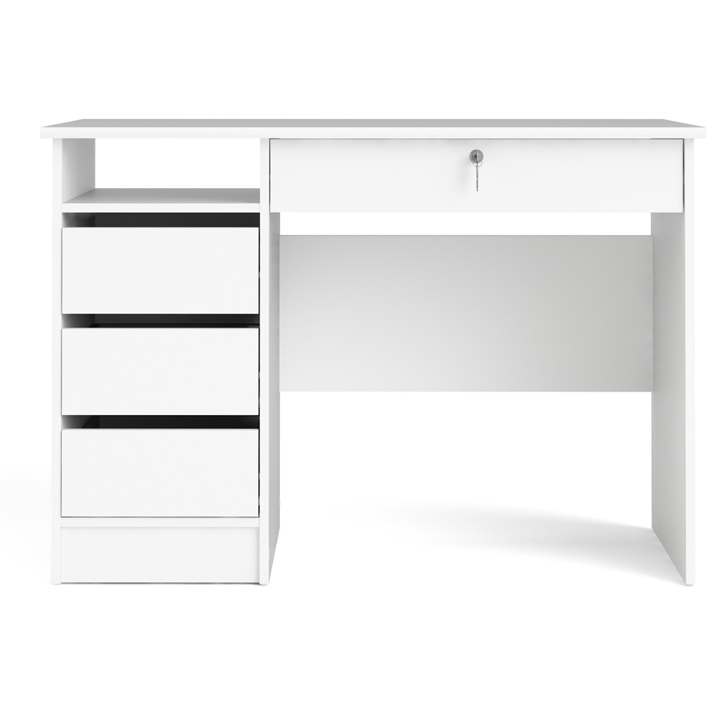 Make a sleek and practical addition to your home decor with the Furniture to Go Function Plus White Desk. It is a superb desk with a modish design that will complement most interior spaces. This desk is crafted using laminated chipboard and eco-friendly materials ensuring resistance to damage, moisture and high temperature. It features a smooth top with three handle-less drawers and one wide drawer that has a lock system with one open shelf for all your essentials. It also features metal drawer runners with a modesty panel and anti-tip safety and safety wall fittings. This desk is designed to be functional even in the smallest of spaces, as it will either tuck neatly into a corner or float in the room to create a modern workstation.
