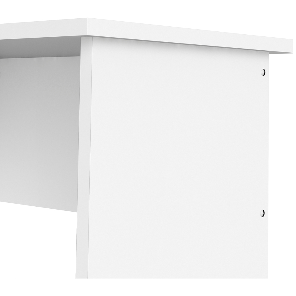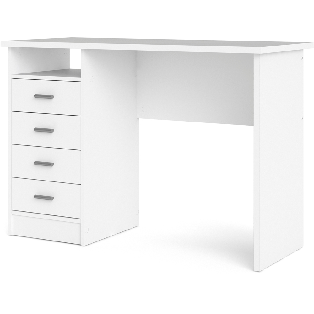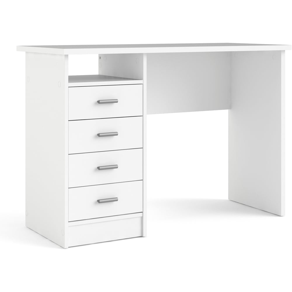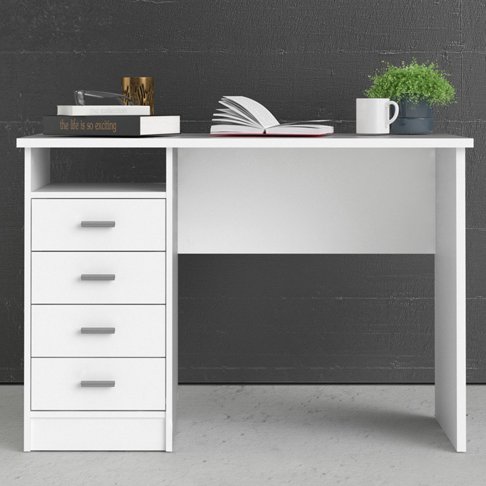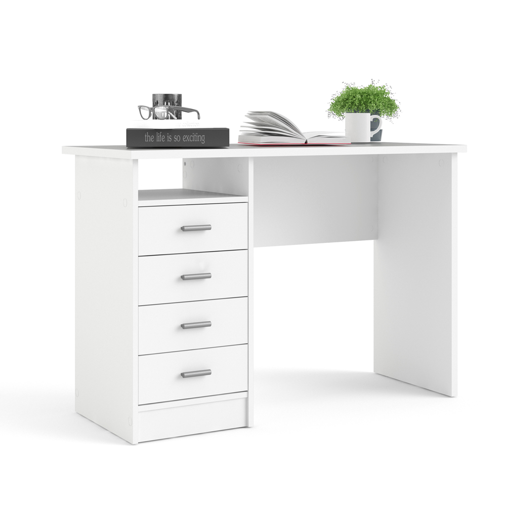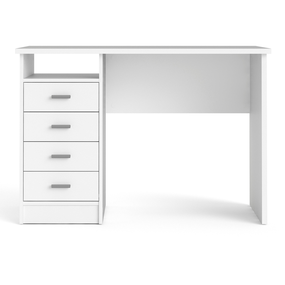 Make a sleek and practical addition to your home decor with the Furniture to Go Function Plus White Desk. It is a superb desk with a modish design that will complement most interior spaces. This desk is crafted using laminated chipboard and eco-friendly materials ensuring resistance to damage, moisture and high temperature. It features four side drawers with smooth metal handles and one open shelf for all your essentials. It also features metal drawer runners with a modesty panel and anti-tip safety and safety wall fittings. This desk is designed to be functional even in the smallest of spaces, as it will either tuck neatly into a corner or float in the room to create a modern workstation.