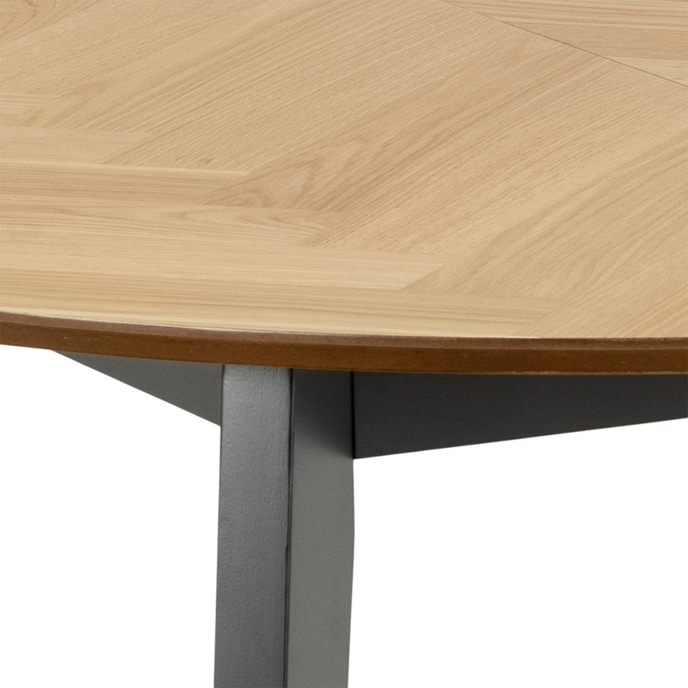 Invite timeless elegance into your dining room with this exquisite round table, featuring a oak effect top with a classic herringbone pattern. The table rests on a sturdy matte black base, offering a sophisticated contrast and a welcoming atmosphere for gatherings.