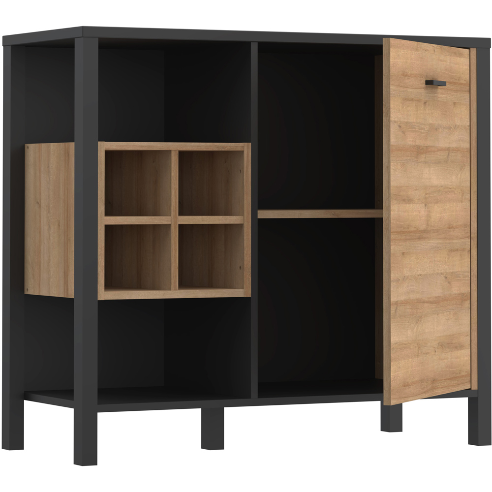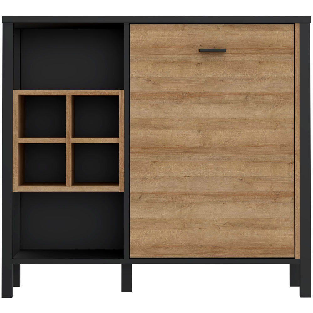 This Furniture To Go High Rock Display Chest features a contemporary design with a perfect blend of the Riviera oak decor with deep matt black accents. It has a single-door structure with shelves and a large top surface to offer a generous storage space. The sleek black metal handles add a touch of elegance, while the table boasts robust metal legs in a frame-like design, contributing to a distinct loft character within the space. Beyond its striking aesthetics, it prioritises functionality with its ingenious storage solutions. It effortlessly fits into any room, from the living room and dining area to the hall, youth room, or bedroom, adding a touch of sophistication and practicality to every corner of the home.