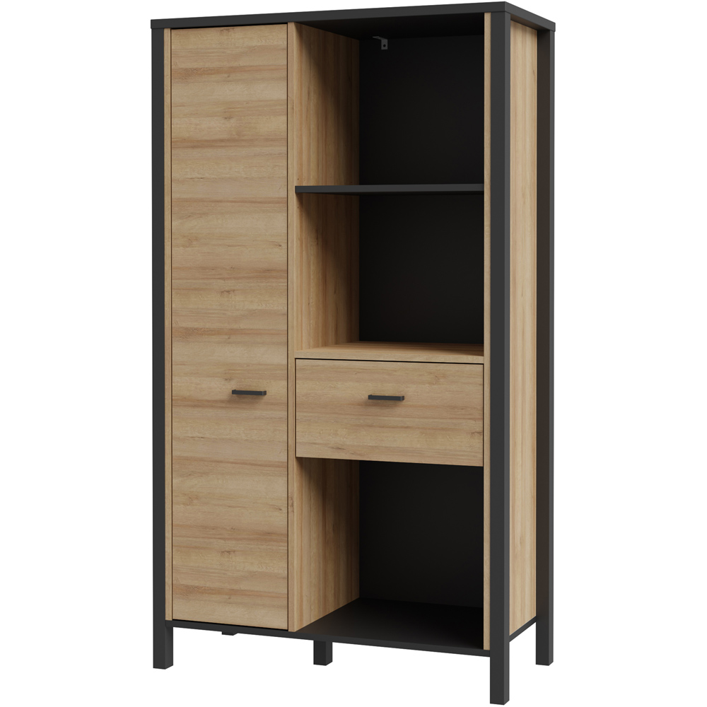 This Furniture To Go High Rock Shelf Unit features a contemporary design with a perfect blend of the Riviera oak decor with deep matt black accents. It has a single-door structure with a drawer and three shelves that offer a generous storage space. The sleek black metal handles add a touch of elegance, while the table boasts robust metal legs in a frame-like design, contributing to a distinct loft character within the space. Beyond its striking aesthetics, it prioritises functionality with its ingenious storage solutions. It effortlessly fits into any room, from the living room and dining area to the hall, youth room, or bedroom, adding a touch of sophistication and practicality to every corner of the home./p>
