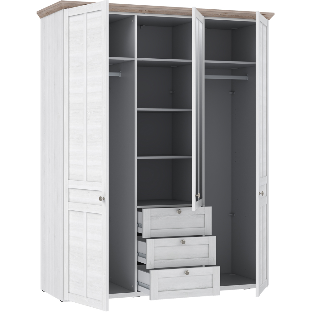Enhance the ambience of your home with the exquisite Furniture To Go Illopa Wardrobe, a seamless fit for any living space. Plus, it offers a generous space to store your essentials with a three-door design and three drawers. Featuring a country-style design, the captivating combination of a beautiful snowy oak effect frame and light warm oak top imbues your home with a sense of tranquillity, fostering an atmosphere of relaxation and peace. Its most outstanding feature lies in its contoured edge and sturdy frame - granting you the freedom to artistically arrange every room in your house, from the inviting hall to the cosy living room.
