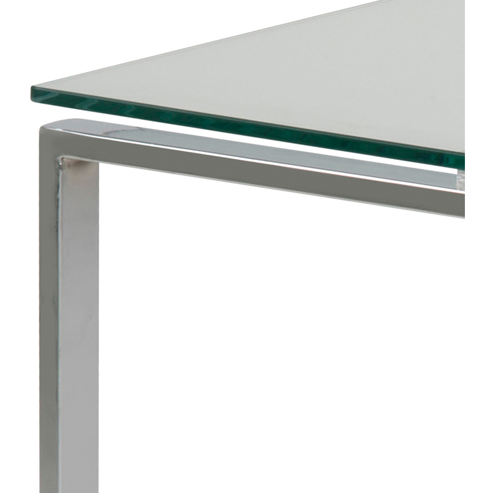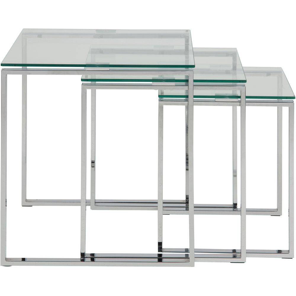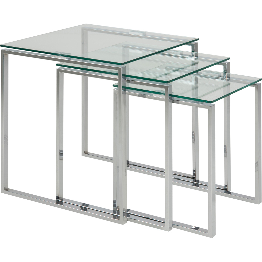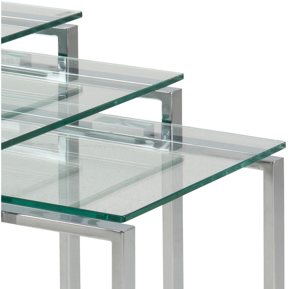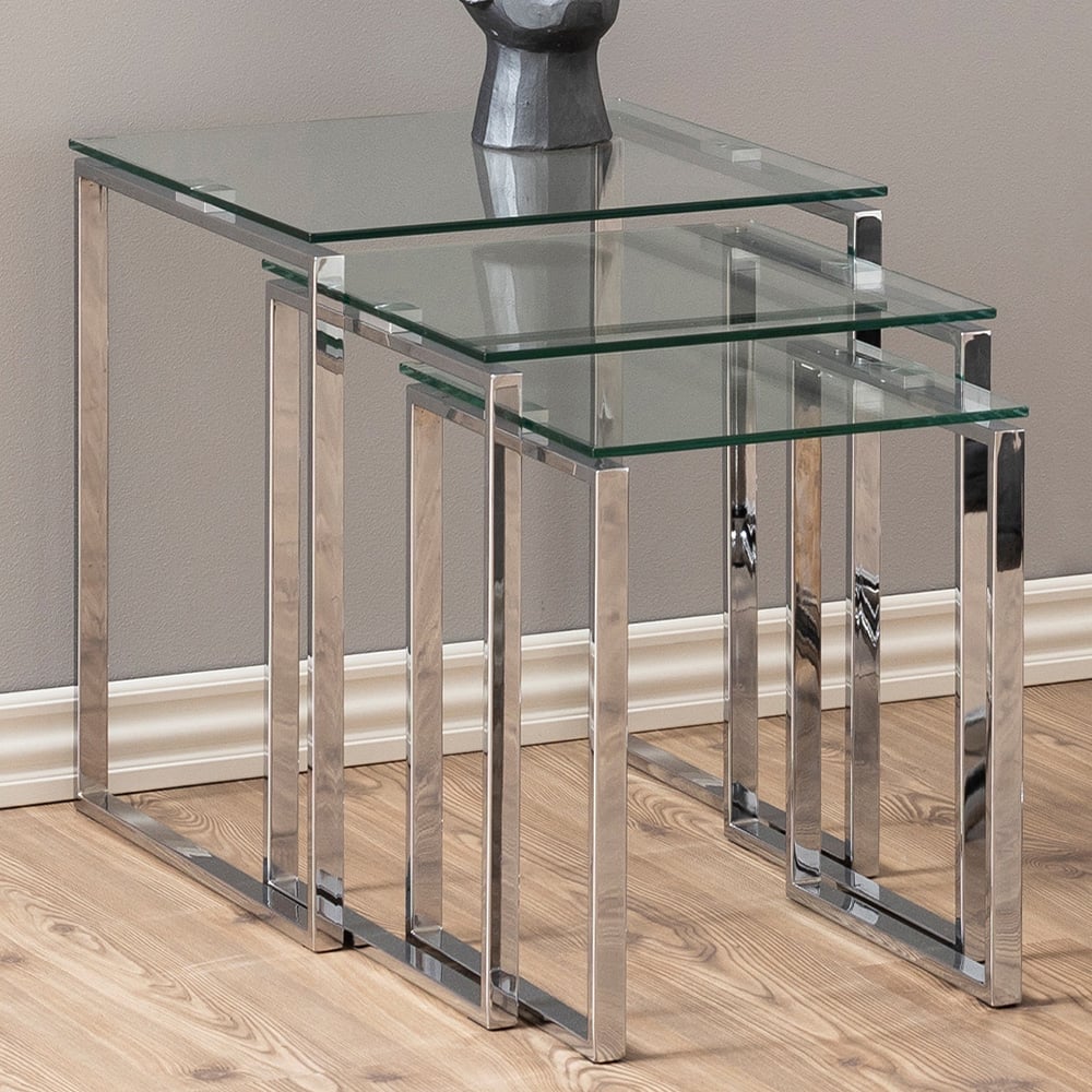 Enhance your space with sleek and modern nest of tables. Featuring a clear tempered glass top and a chic chrome steel sledge base, this versatile set of three seamlessly blends functionality with a touch of elegance.