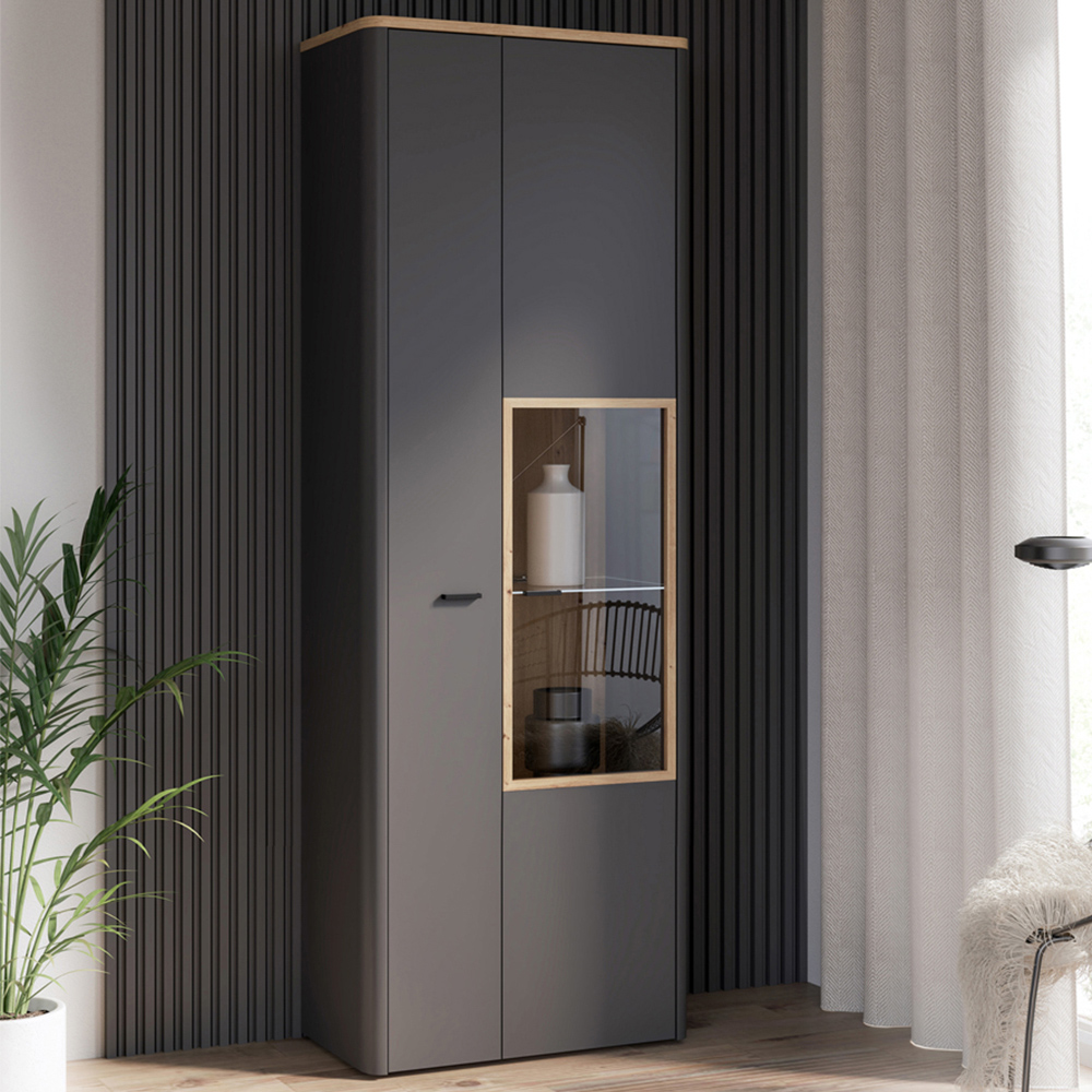 Enhance your space with the Klara Display Cabinet in Grey and Oak. Modern design, perfect for small spaces, and convenient silent closing for ease of use. It also offers convenient use thanks to silent closing.