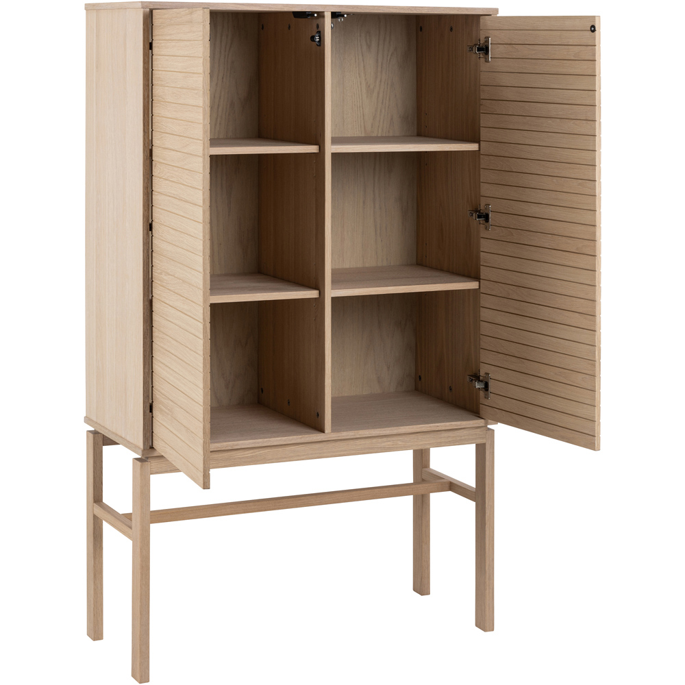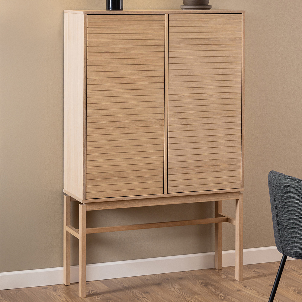 Enhance your home with the minimalist charm of this cabinet, featuring a white pigmented oiled oak effect. The clean lines are complemented by a lamella design and a convenient push-to-open function, offering ample storage with two doors and four shelves.
