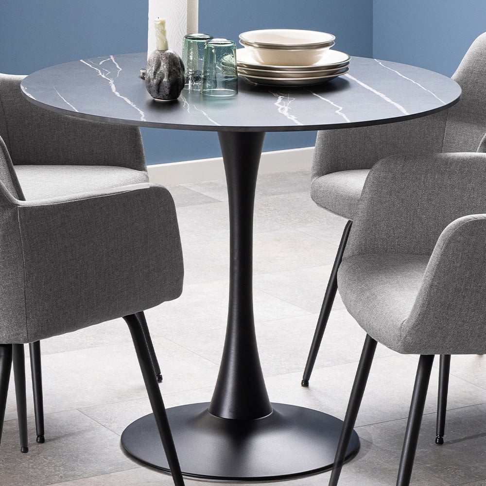 Discover the essence of chic design with our round dining table, featuring a sophisticated matt black ceramic top paired with a bold, matte-finished steel base. Its contemporary silhouette is sure to make a statement in any dining space.