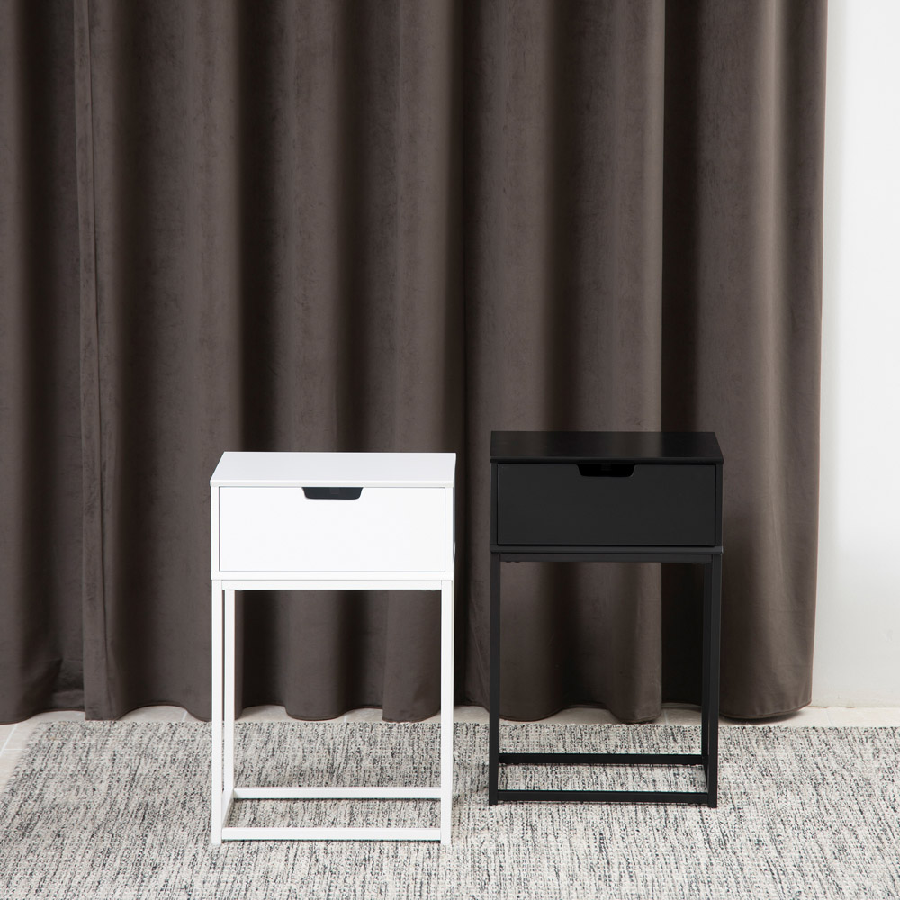 A fusion of contemporary style and practicality. Crafted with a top and drawer in black MDF and a sleek black powder-coated steel base, this table adds a touch of modern elegance to any bedroom. Perfect for keeping your essentials close at hand while elevating your decor.