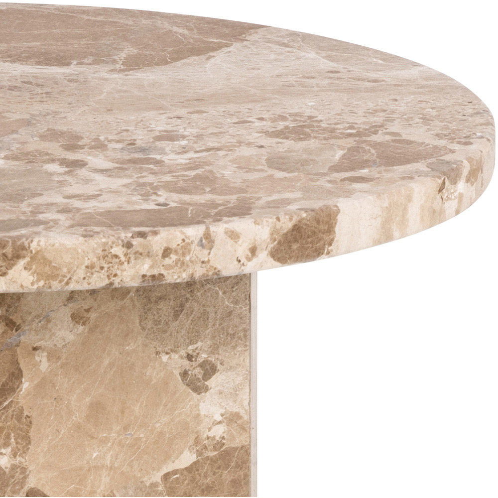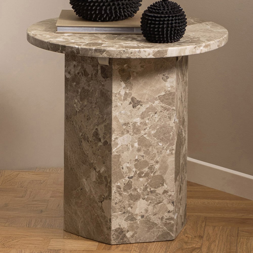 Geometric side table with clean lines and unique stone variations. Round tabletop and hexagonal pillar base add drama and sophistication to any interior.