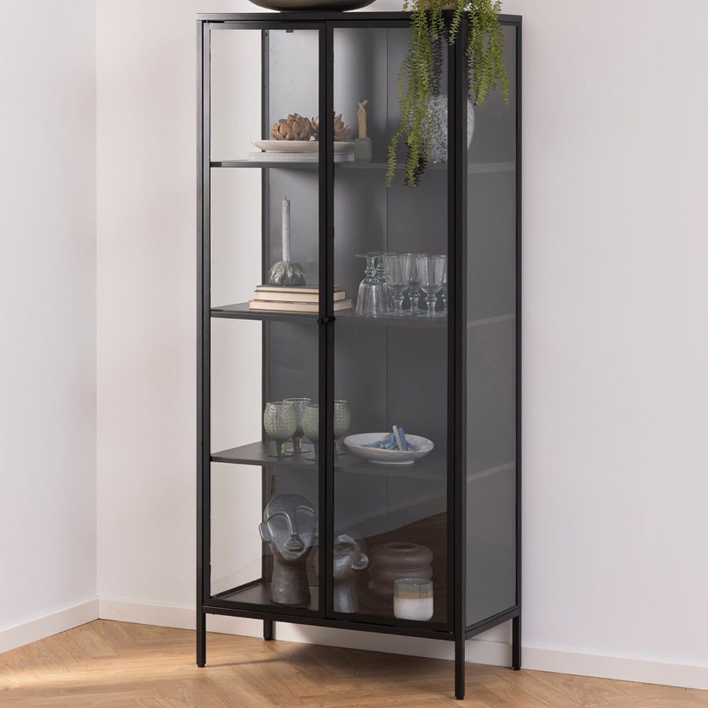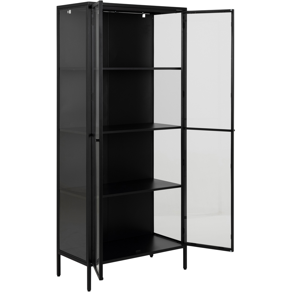 A stylish showcase for your prized possessions. Crafted with a top, frame, 4 shelves, and base in matt black rough powder-coated steel, it exudes modern sophistication. Featuring two doors with clear tempered glass panels and matt black rough powder-coated steel accents, this cabinet adds a contemporary touch to your space.