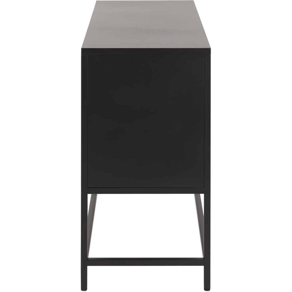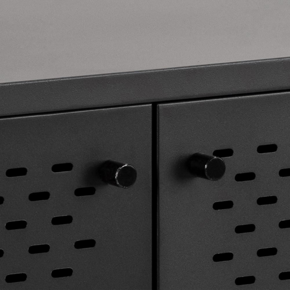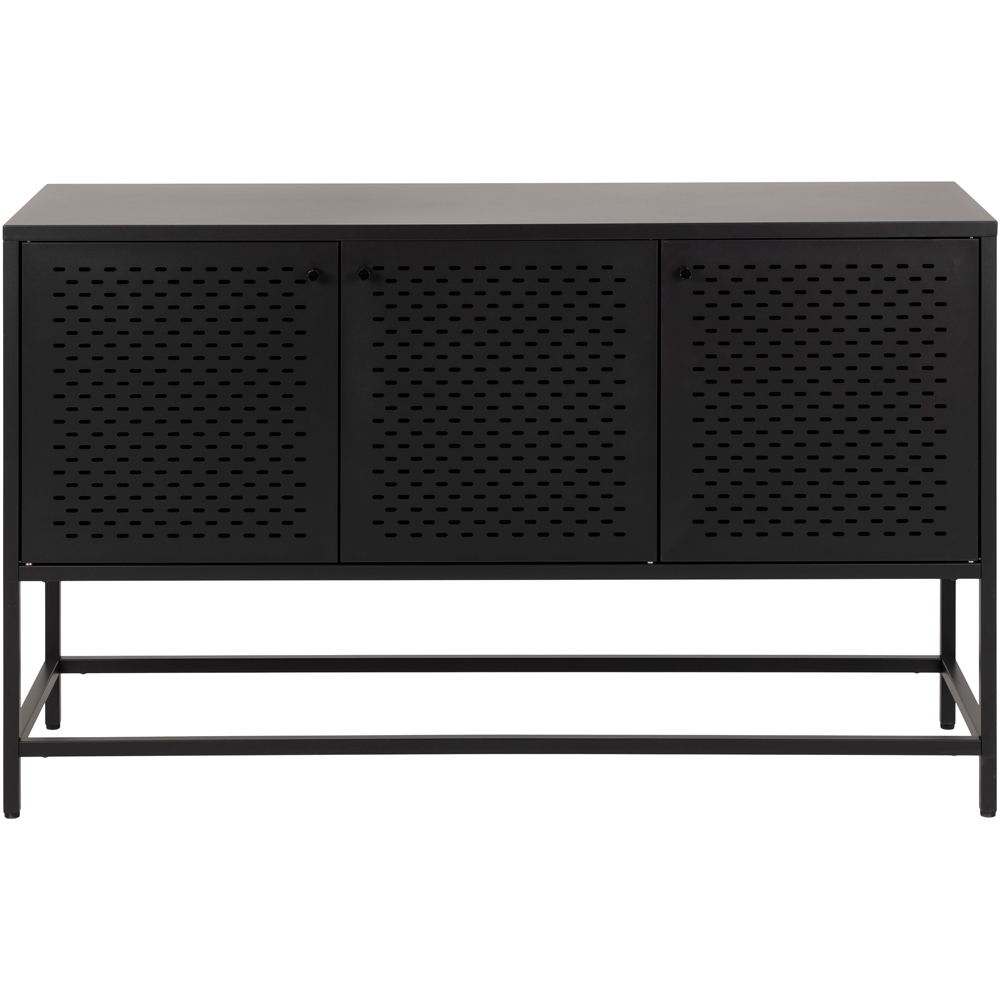 This sideboard is a modern addition to your home. Crafted with a top, frame, 3 doors, 2 shelves, and base in matt black rough powder-coated steel, it exudes industrial chic. Featuring metal mesh details, this sideboard adds both style and functionality to any space.