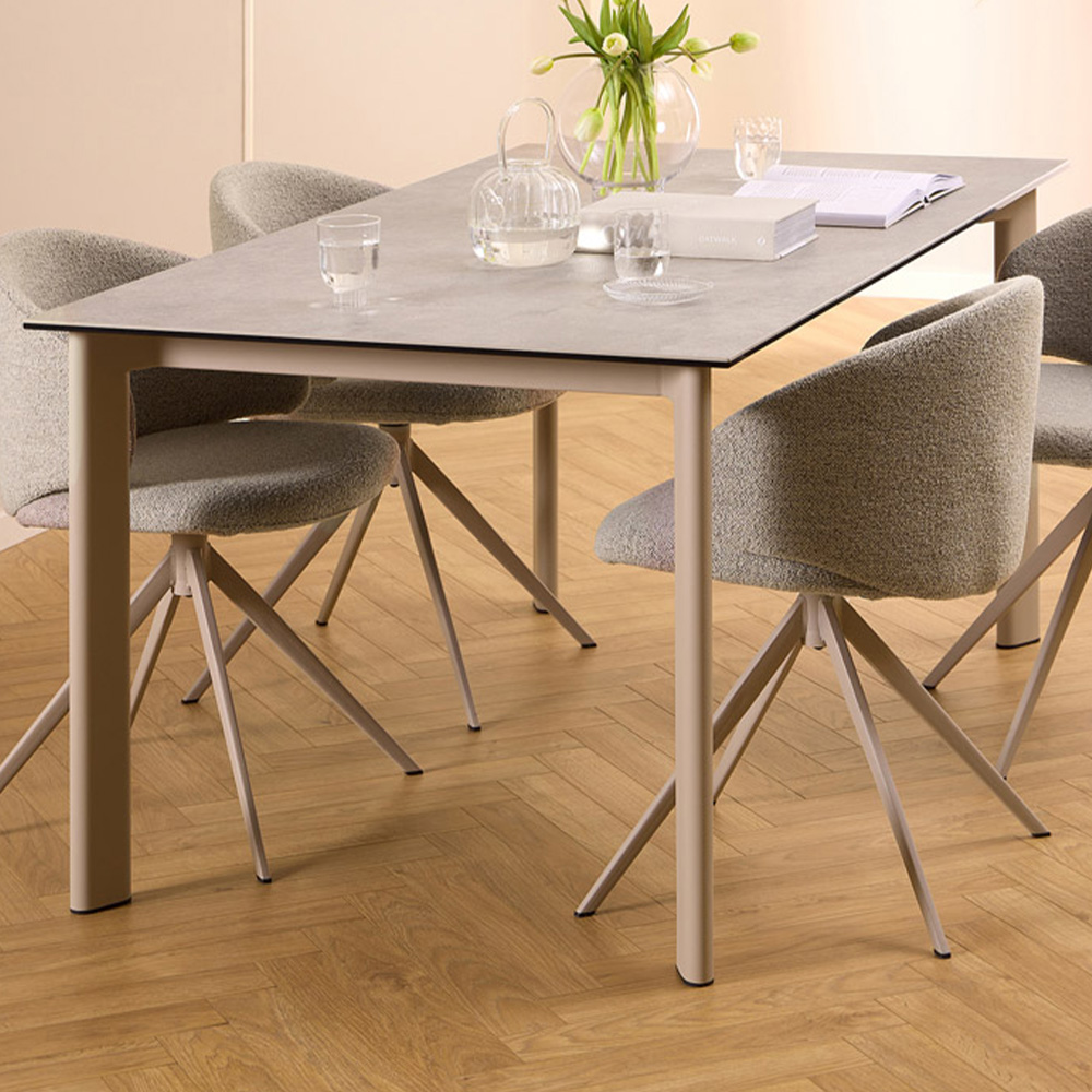 The Palermo rectangular dining table combines durability and style with its sleek design. The 160x90 cm top is made from grey Anista rough ceramic, featuring a heat and scratch-resistant surface for lasting use. The straight legs, crafted from grey rough powder-coated steel, add a modern industrial touch. This table comfortably seats six people, making it an ideal choice for contemporary dining rooms.