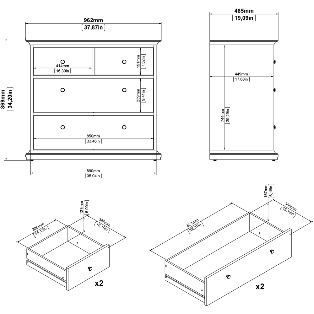 Add a touch of elegance to your living space with this Paris Storage Chest by Florence. This contemporary storage chest features an elegant design completed with a simple metal handle. Its matt grey finish offers a clean and modern look that seamlessly uplifts your interior. This storage chest features two large drawers at the bottom and two small drawers at the top with easy gliding drawer runners, which are easy to assemble and offer sufficient storage space to arrange your essentials. This chest also features a high-quality laminated board. Apart from offering a convenient storage space, this chest also enhances your decor.